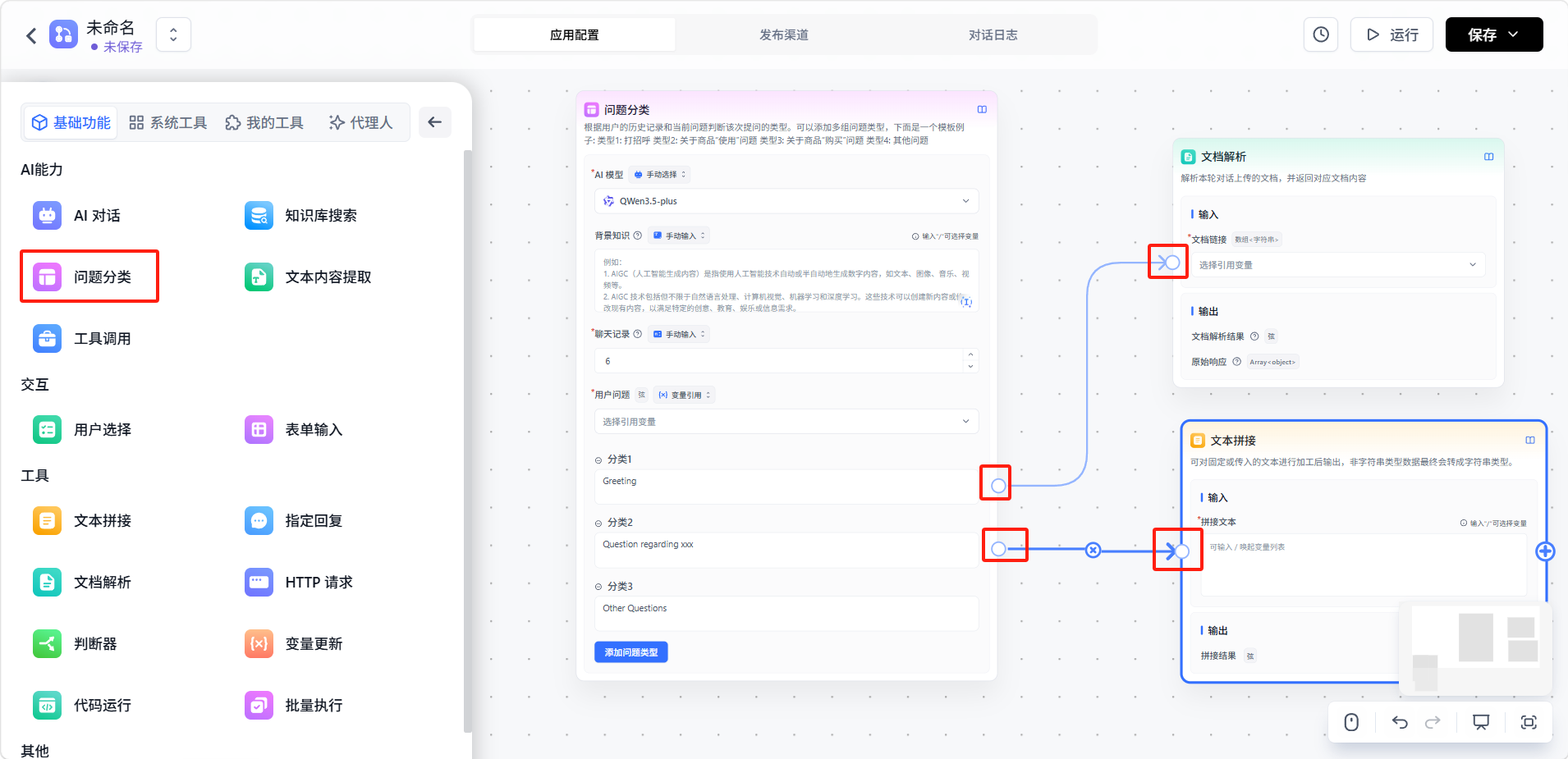 工作流是 FastGPT 最强大的功能之一,通过可视化拖拽节点和连线的方式,用户无需编写代码即可构建复杂的 AI 应用逻辑。工作流节点分为 AI 能力、交互、工具和其他四大类别。