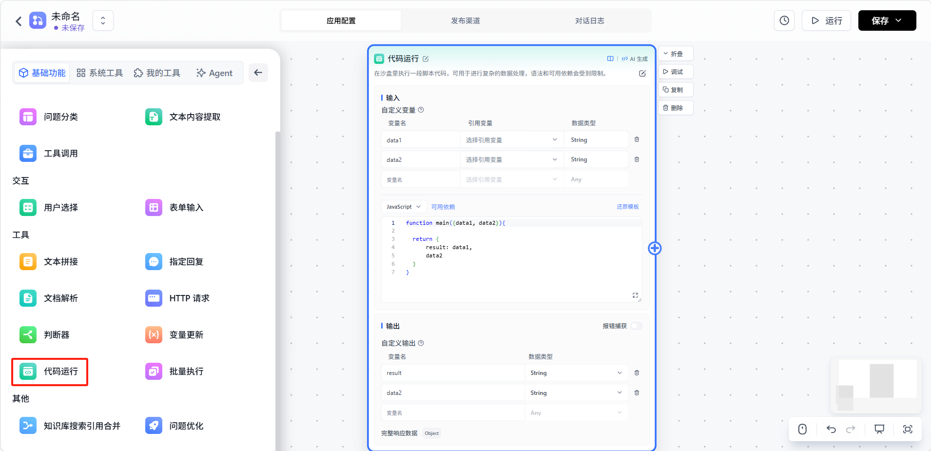 代码运行节点允许在工作流中执行自定义的 JavaScript 代码,实现复杂的数据处理逻辑。