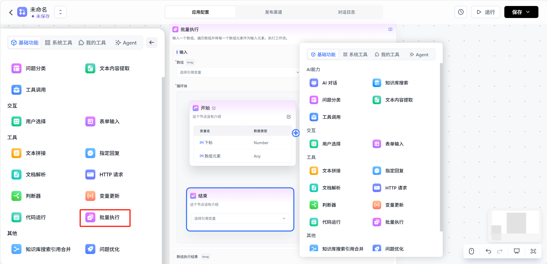 批量运行(循环)节点支持对数组类型的数据逐条执行相同的处理流程。