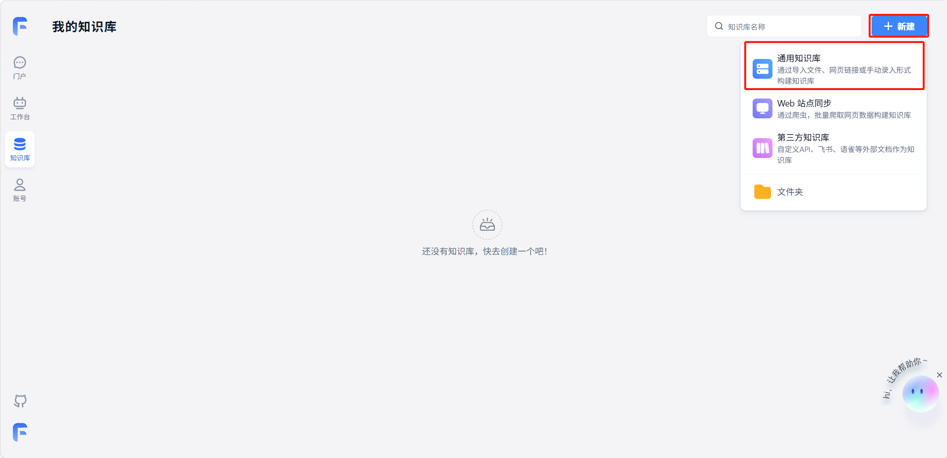 点击右上角「+ 新建」,选择「通用知识库」。