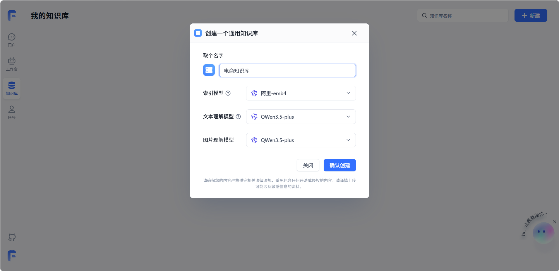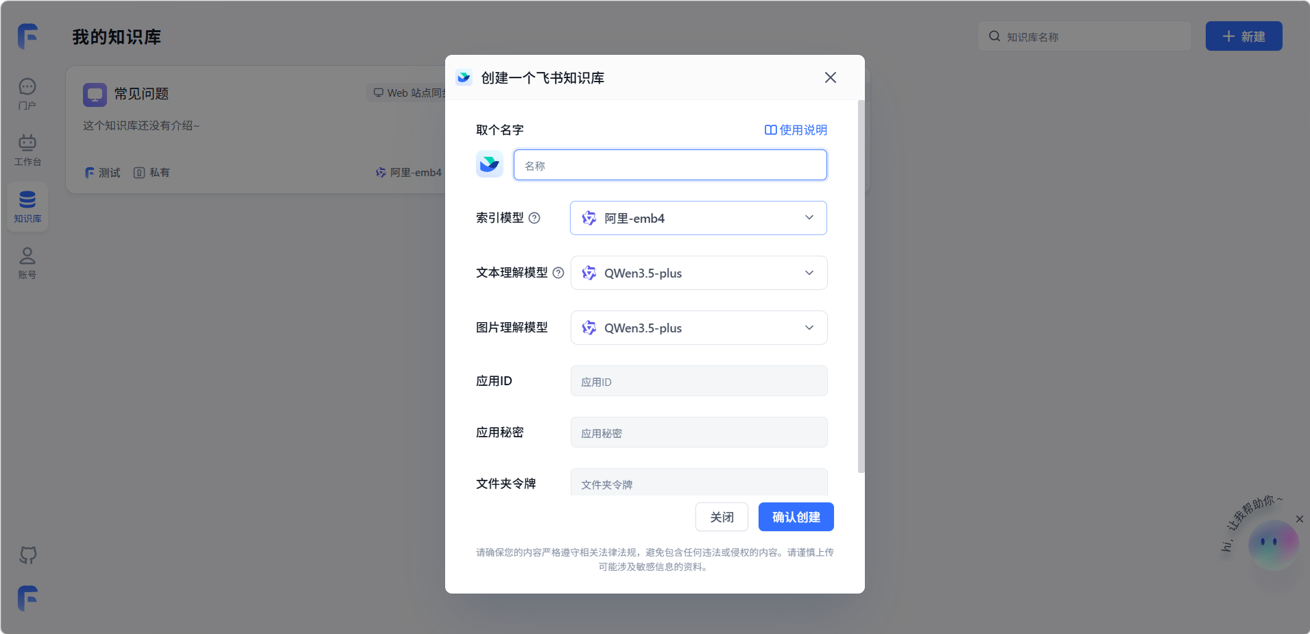 填写知识库名称和其他配置。