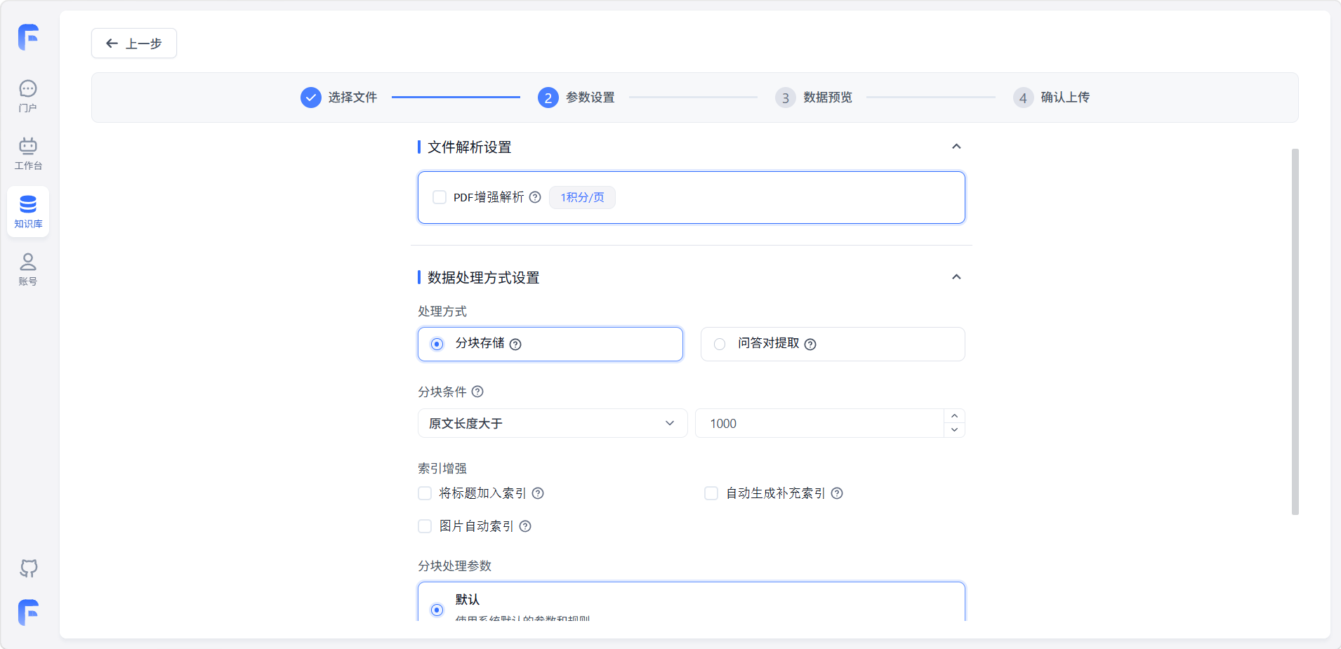 导入文件到知识库时,系统需要把内容"切碎"处理,方便后续搜索。以下是各项配置: