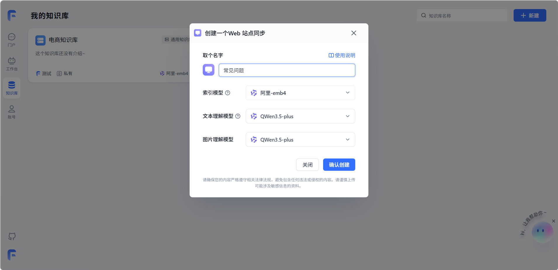 填写名称,选择索引模型、文本理解模型和图片理解模型,然后点击「确认创建」。