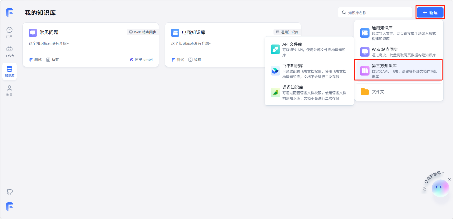 点击「+ 新建」,选择「第三方知识库」,选择知识库类型。