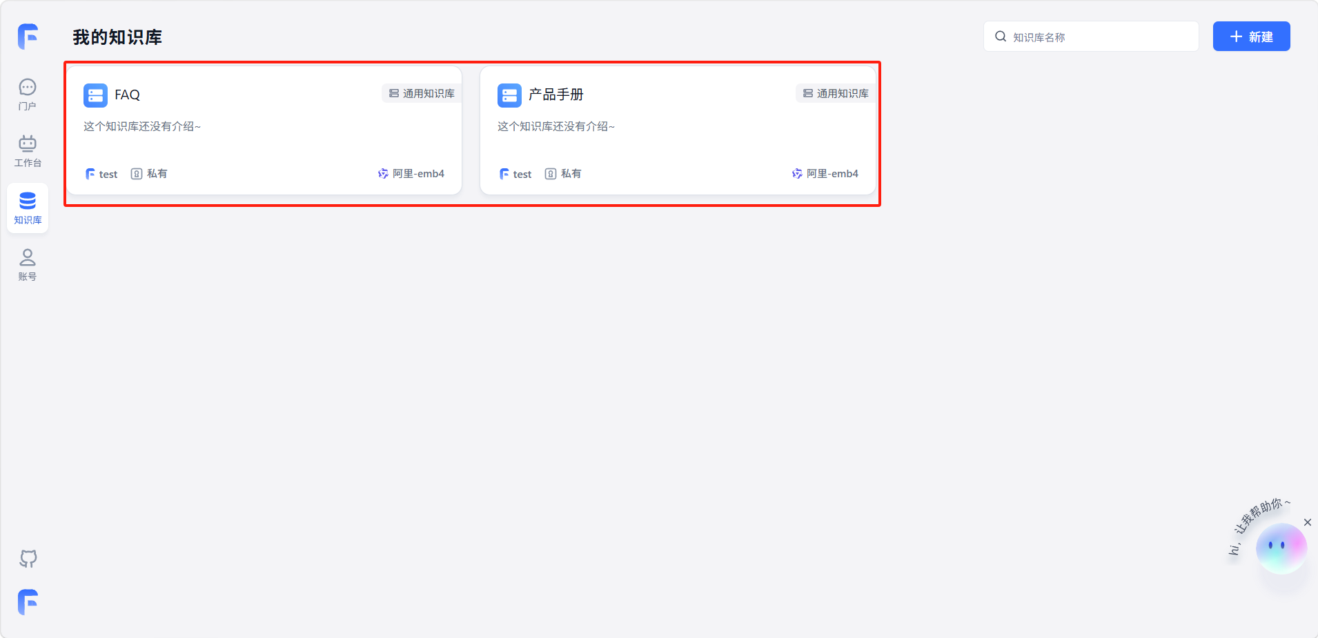进入知识库页面,创建「产品手册」和「FAQ」两个通用知识库,分别导入相关文档。