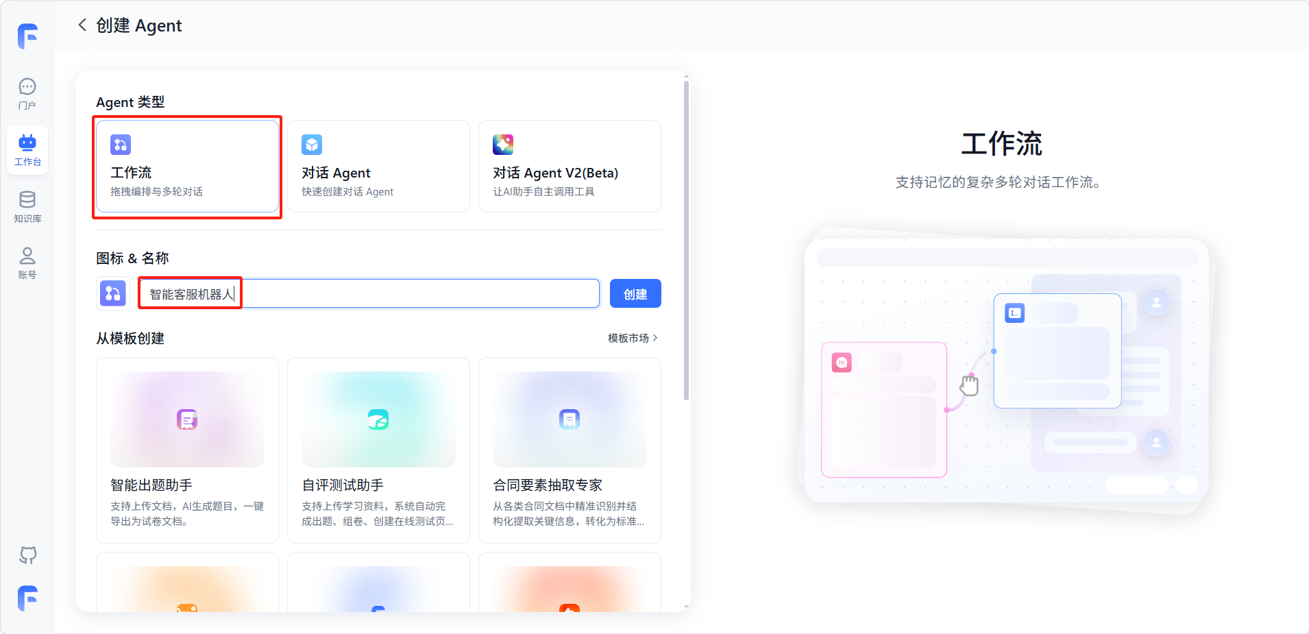 在工作台点击「新建」,选择「工作流」类型,输入名称"智能客服"。