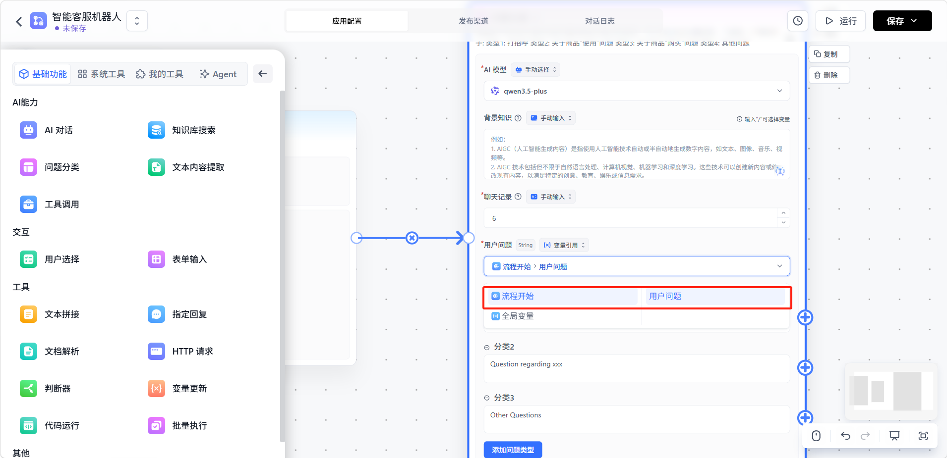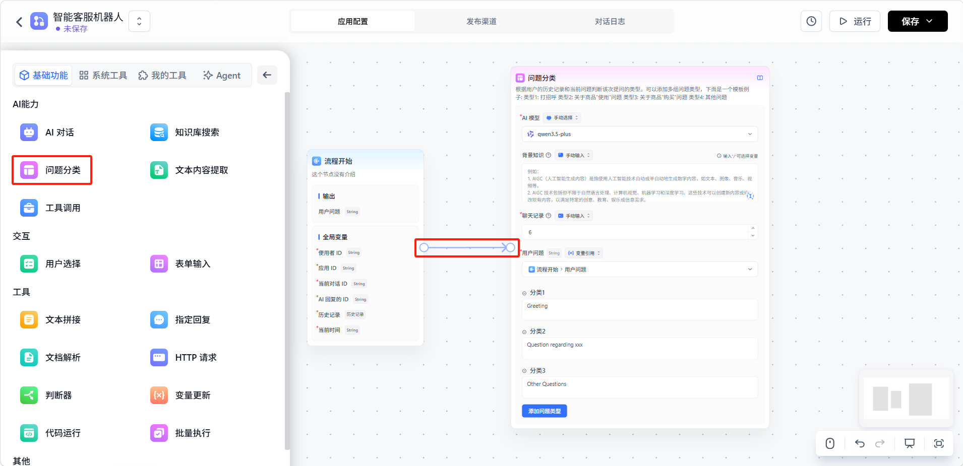 添加「问题分类」节点,与开始节点相连。