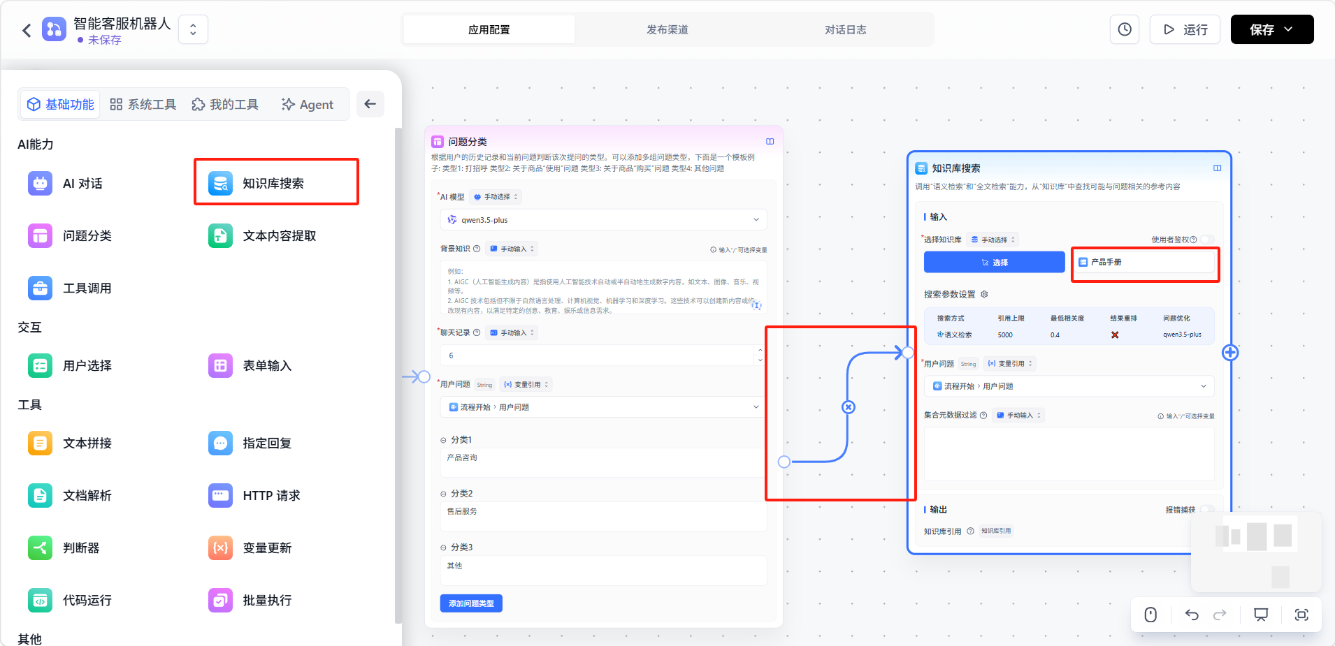 在「产品咨询」分支添加并连接「知识库搜索」节点,关联「产品手册」知识库。