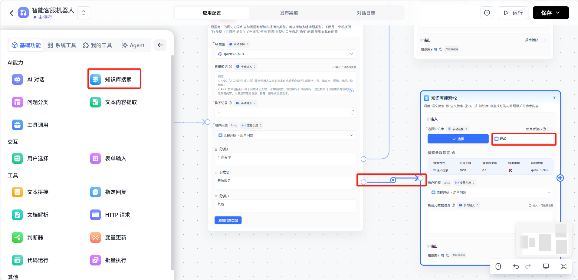在「售后服务」分支添加「知识库搜索」节点,关联「FAQ」知识库。