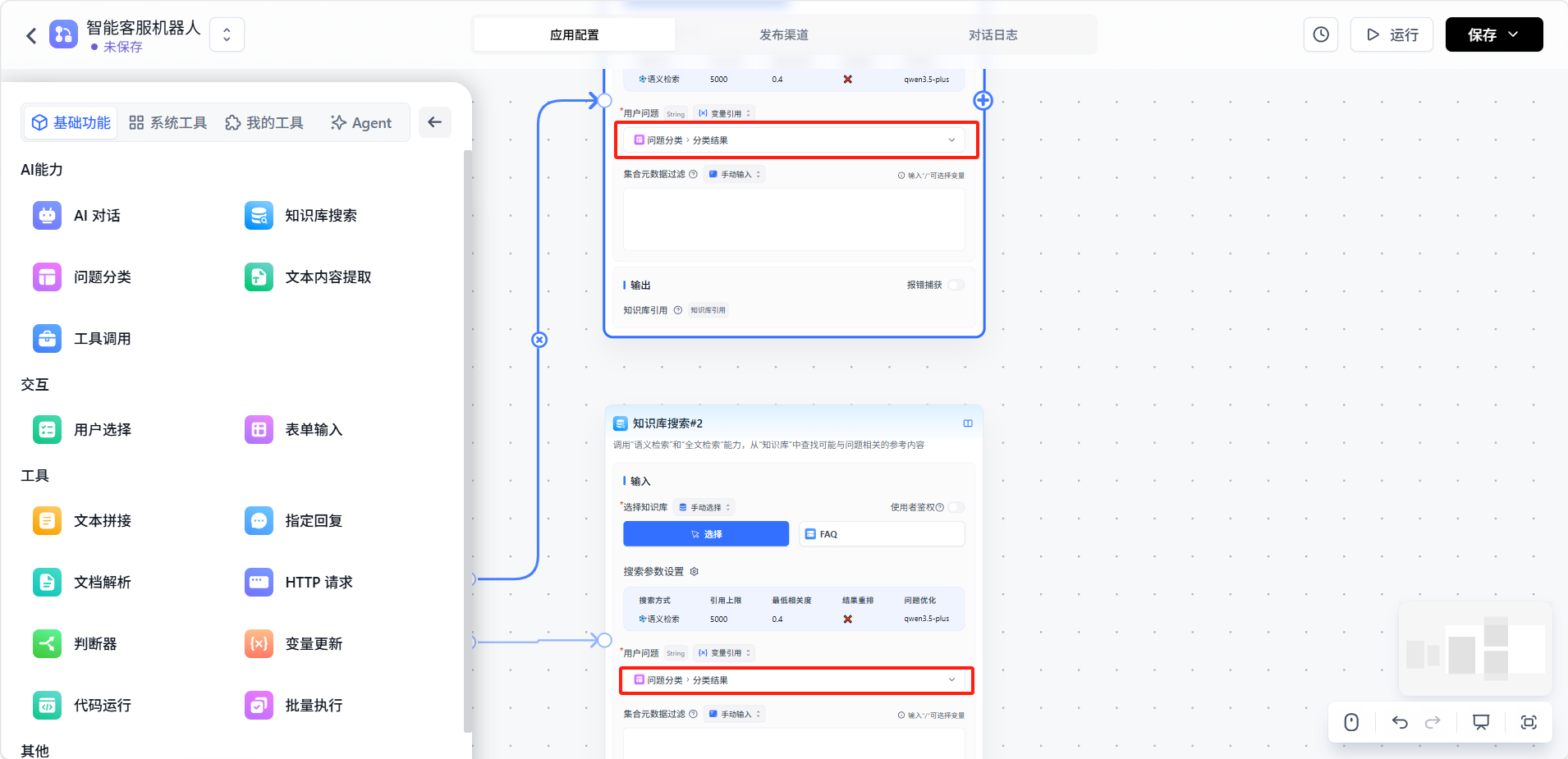 将两个知识库节点的变量引用设置为「问题分类」节点的「分类结果」。