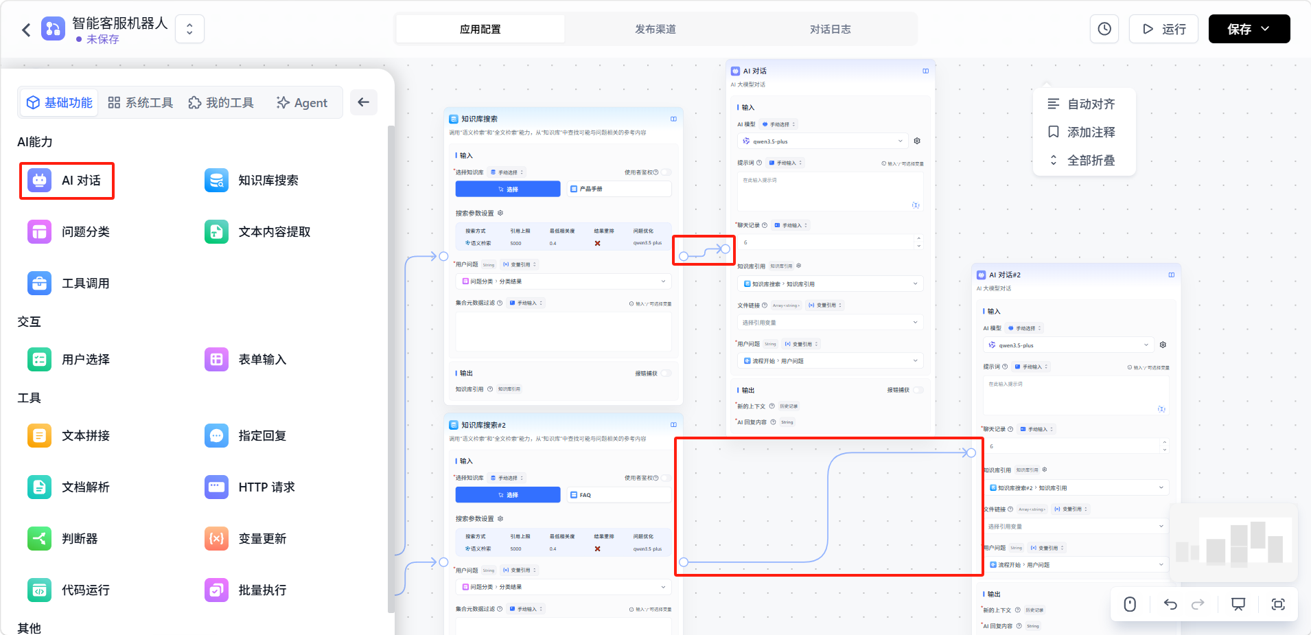 两个「知识库」节点分别添加「AI 对话」节点。