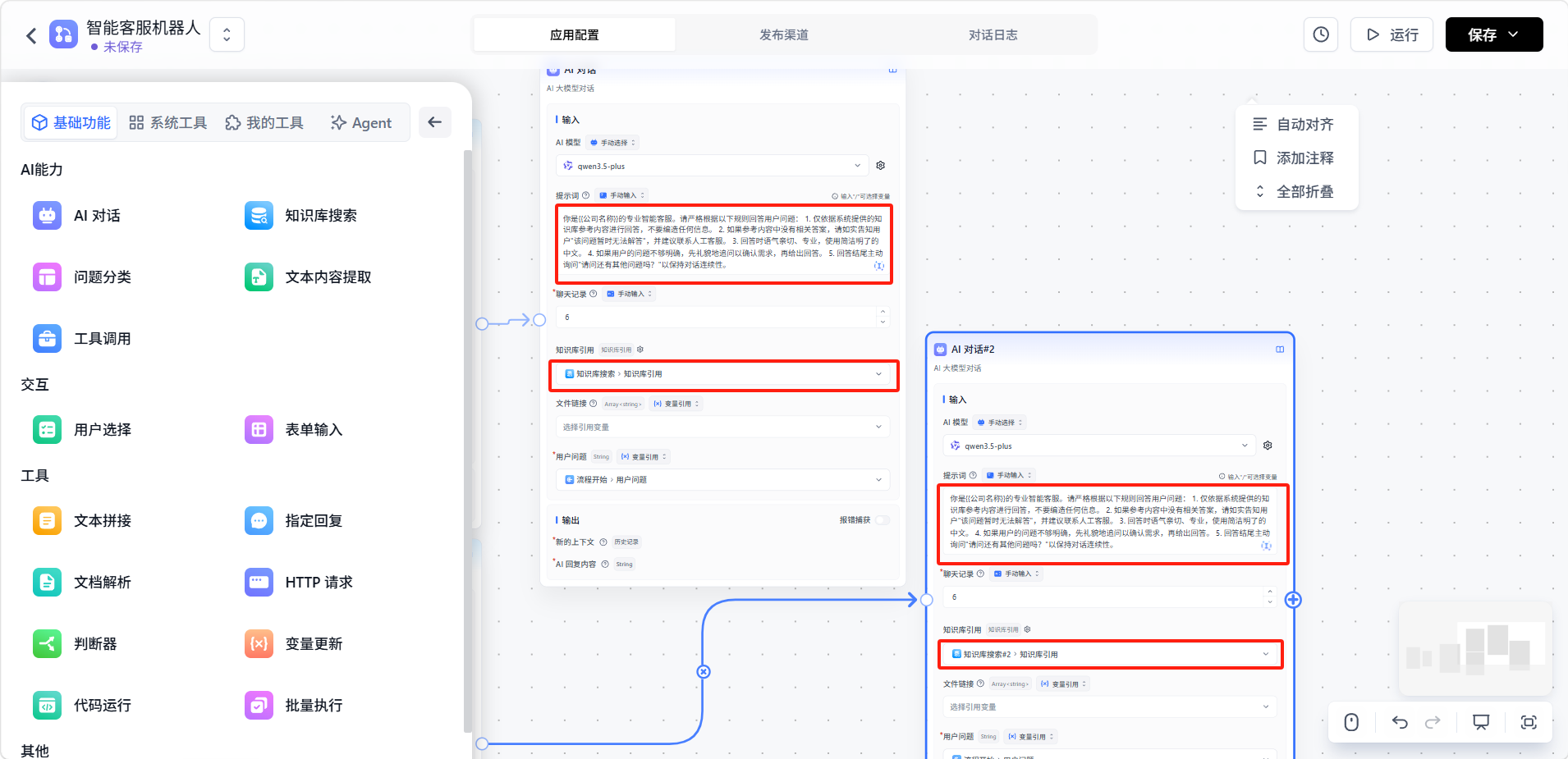 设置两个「AI 对话」对话节点的提示词,并将变量引用为「知识库」引用。