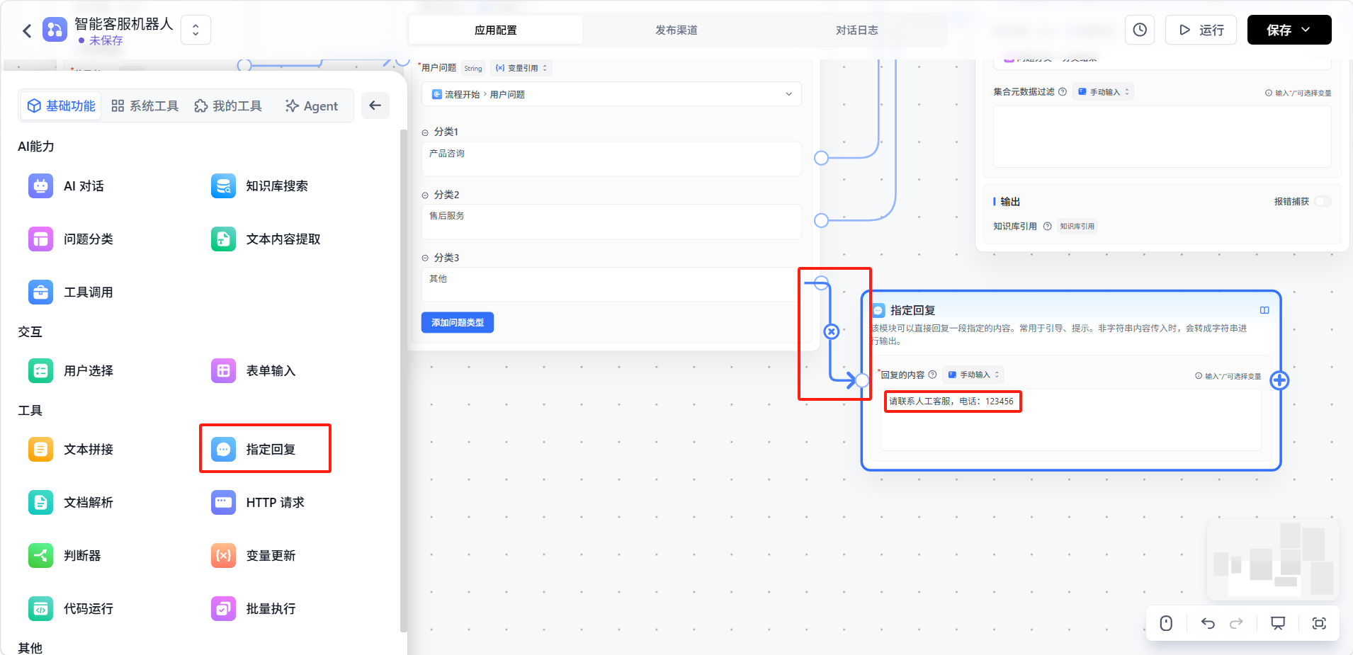 在「其他」分支添加「指定回复」节点,引导用户联系人工客服。