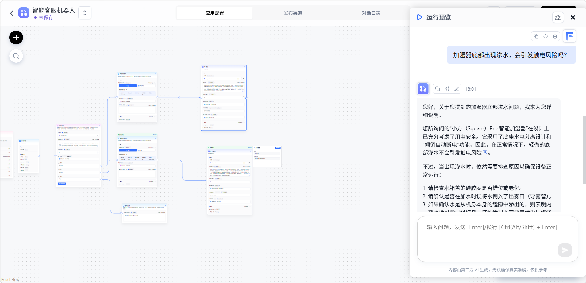 在测试对话框中输入各类问题,验证工作流的正确性。