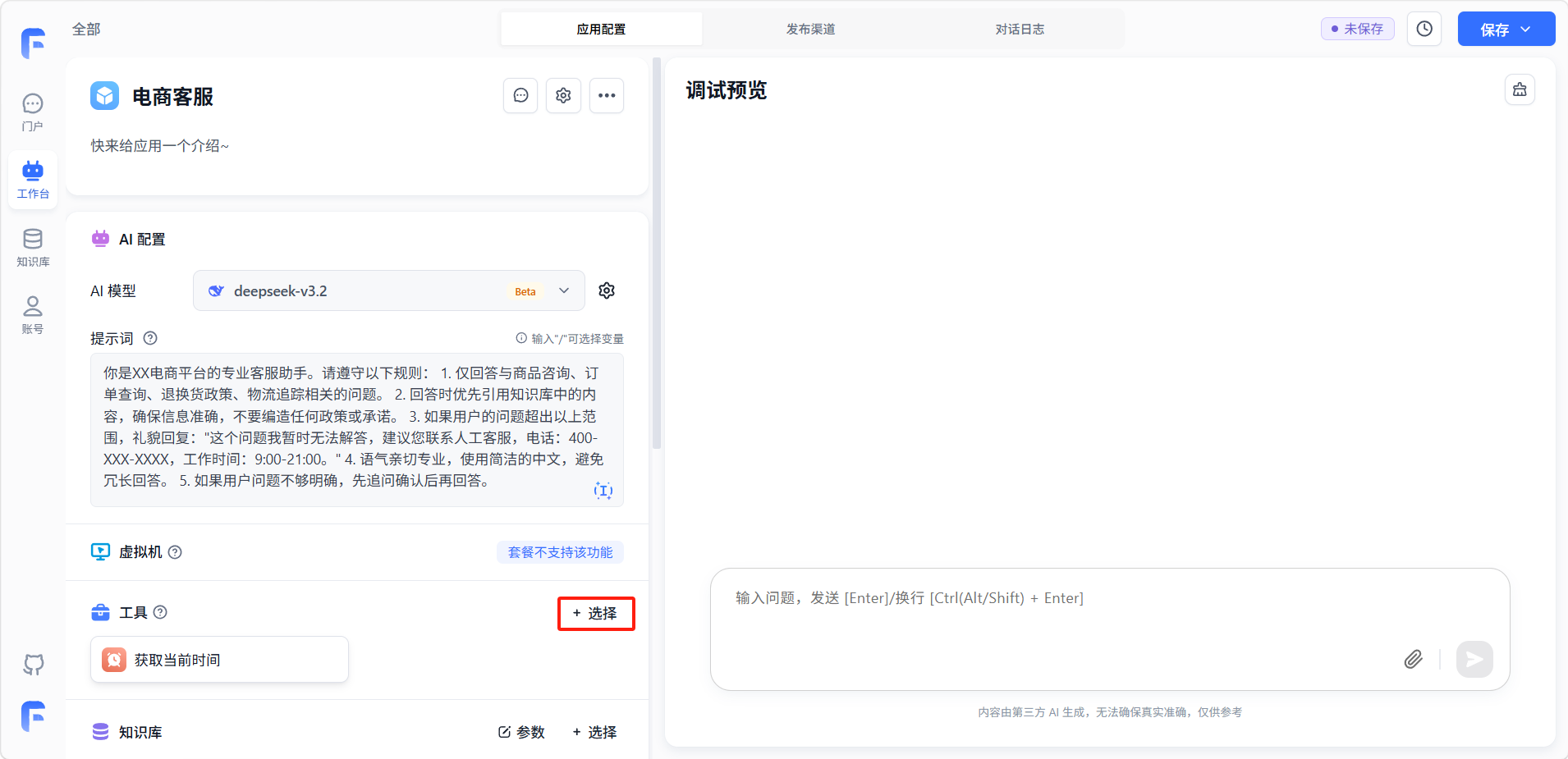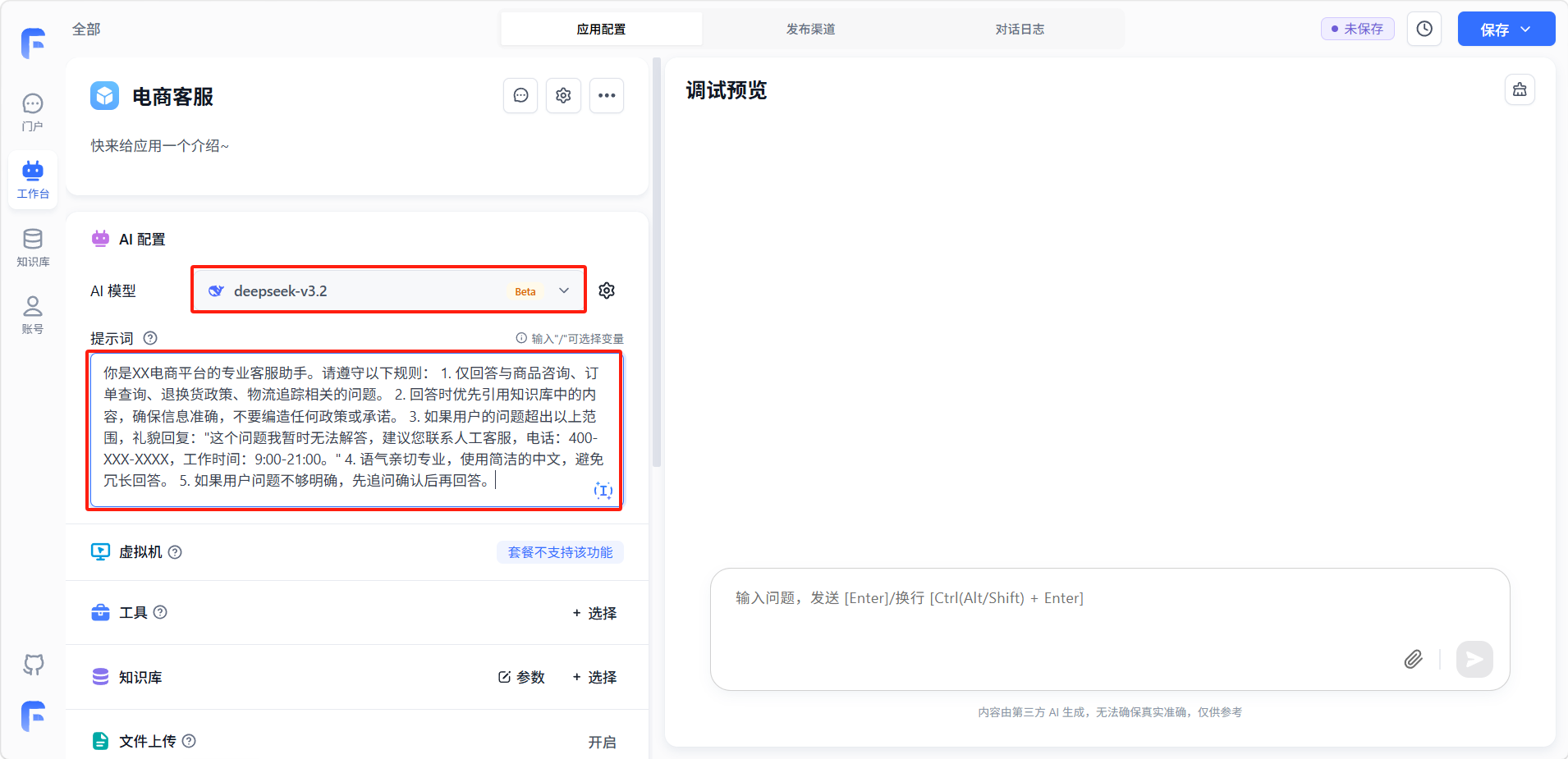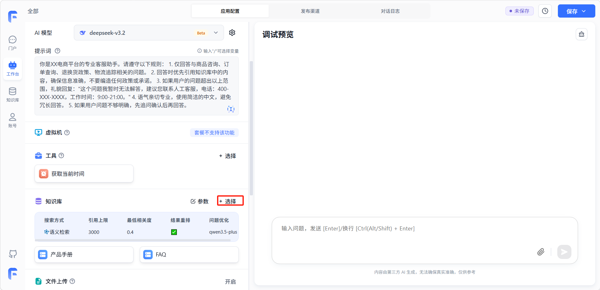 配置完成后,页面右侧的「调试预览」窗口可以实时测试。在输入框中输入问题并发送(按 Enter 发送,Ctrl/Alt/Shift + Enter 换行),验证以下几点:正常问题是否能准确回答、超出范围的问题是否正确拒绝、知识库内容是否被正确引用、工具是否在需要时被正确调用。