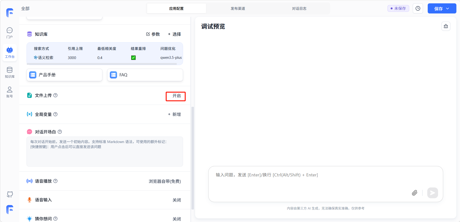 开启文件上传功能,允许用户在对话中上传文件。