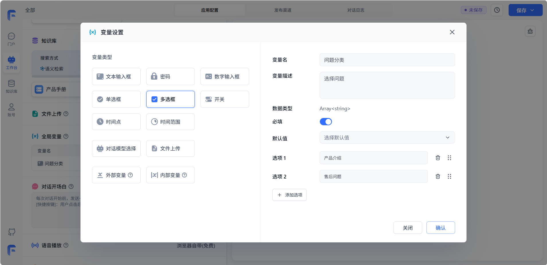 点击全局变量「+ 新增」添加一个多选框 。设置为必填,让用户在对话前先填写一些信息,进行问题分类。