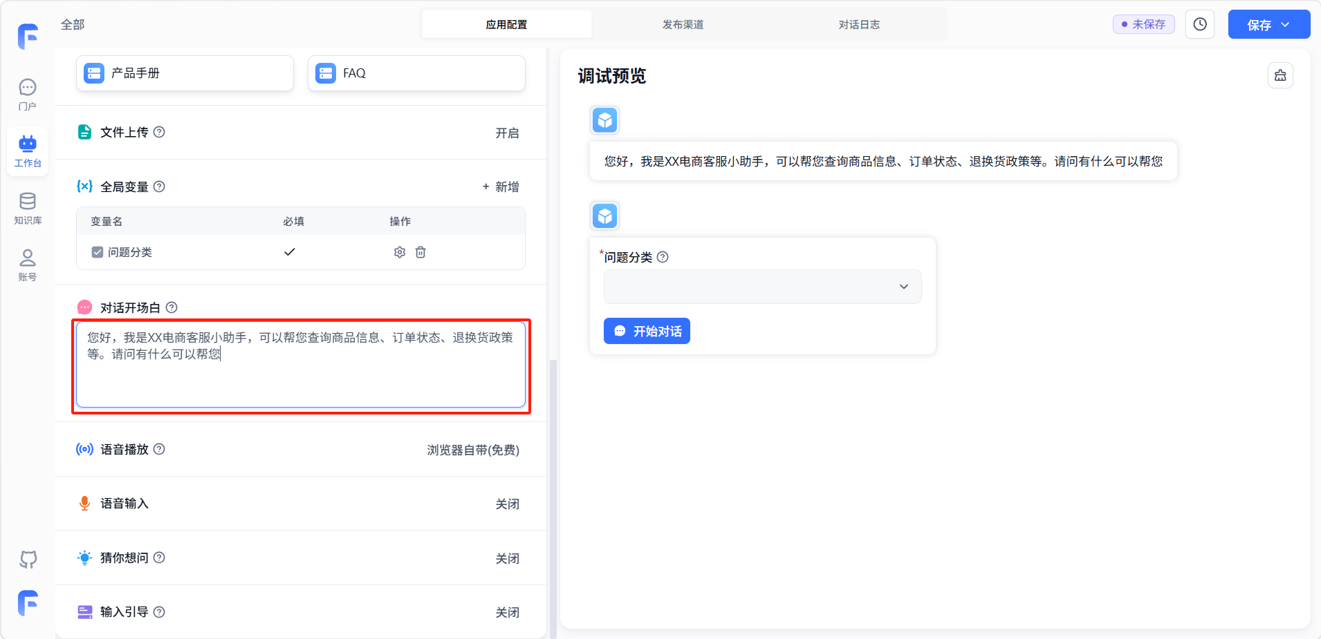 设置对话开场白。