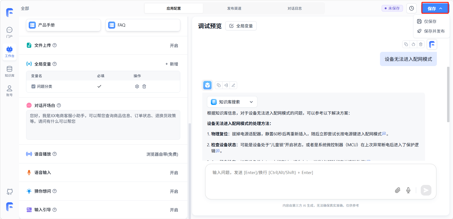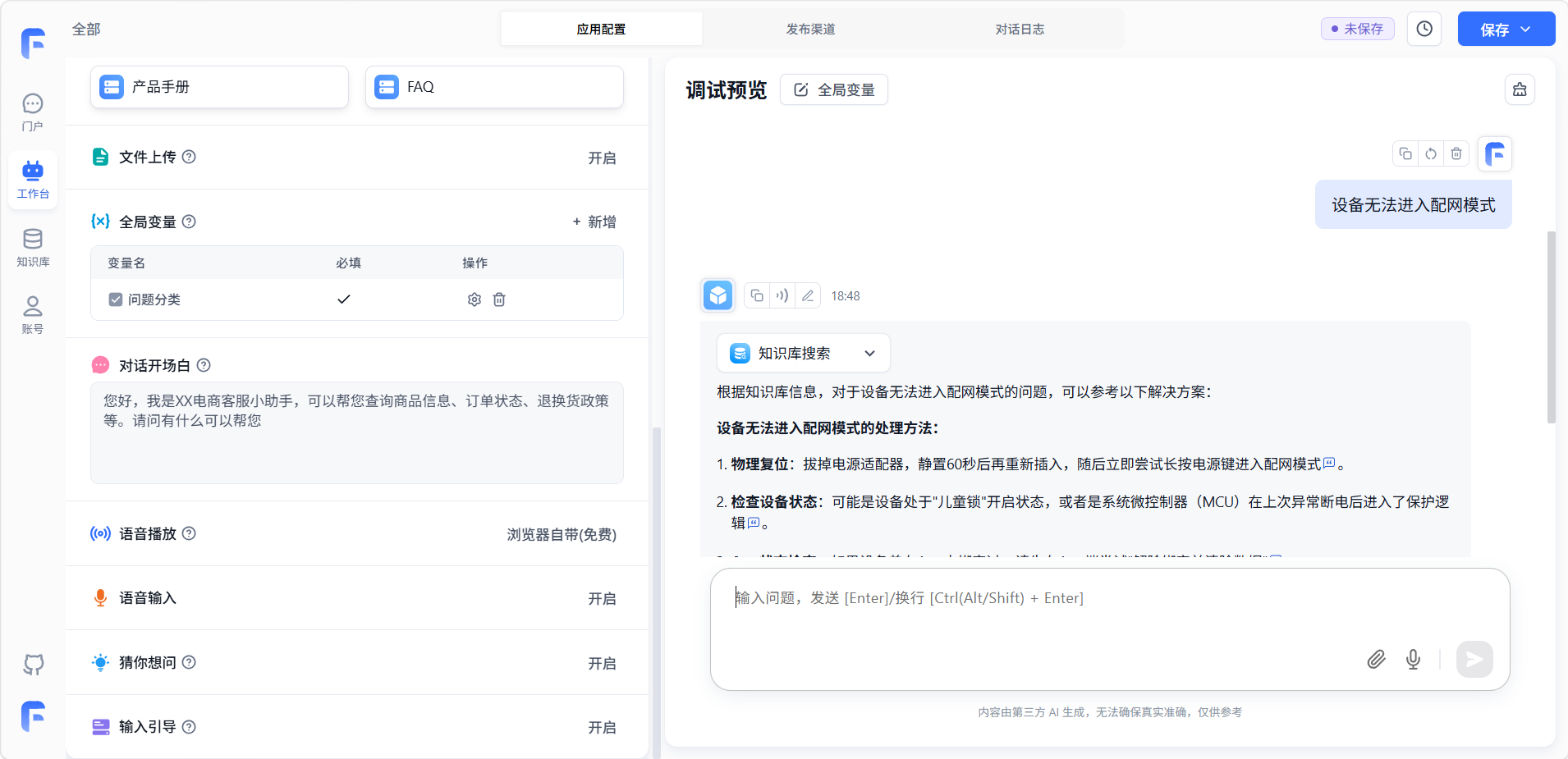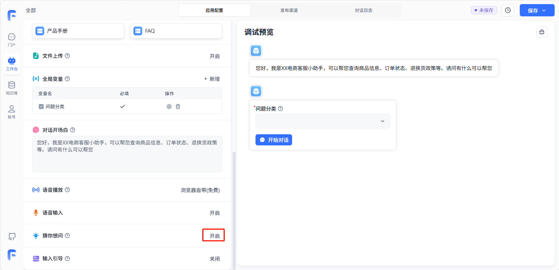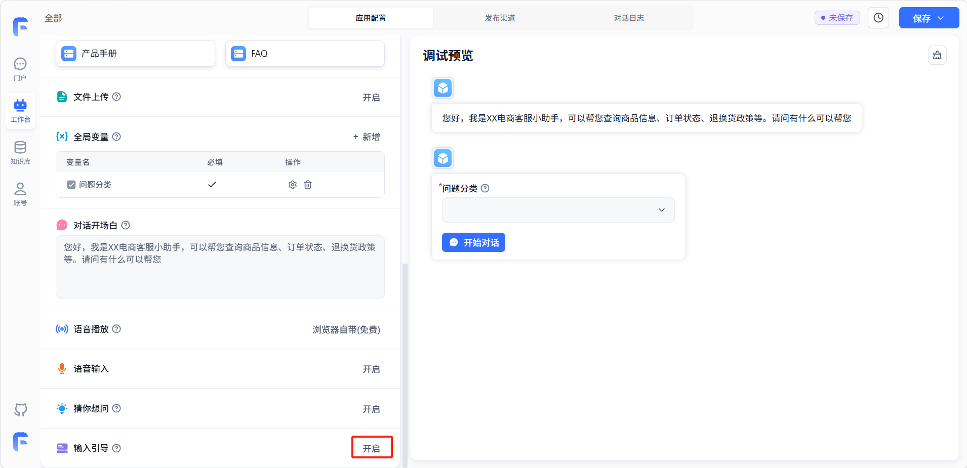 「输入引导」可以预设一些常见问题,开启后用户输入时会获取预设问题的相关提示。