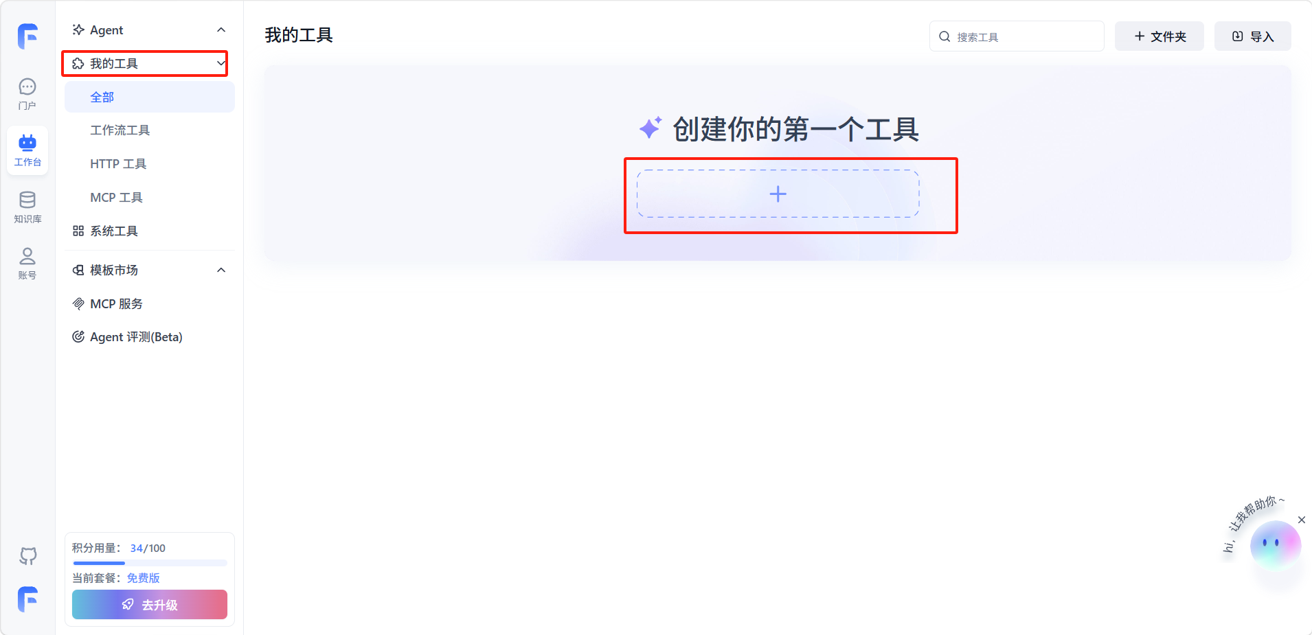 在 FastGPT 左侧导航栏中找到「我的工具」入口,点击进入工具管理页面点击「创建工具」来新建自定义工具。
