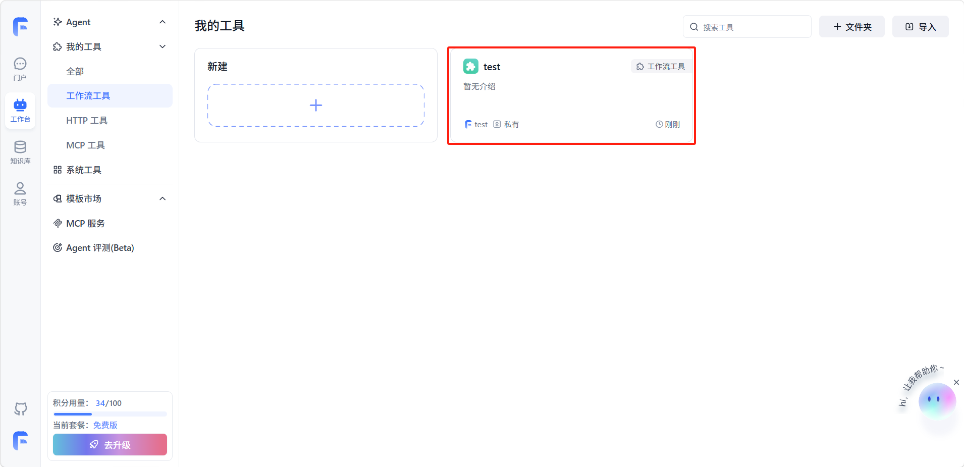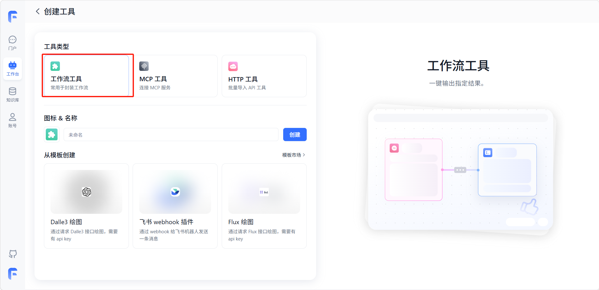 在工具类型选择页面中选择「工作流工具」,设置名称后点击创建。