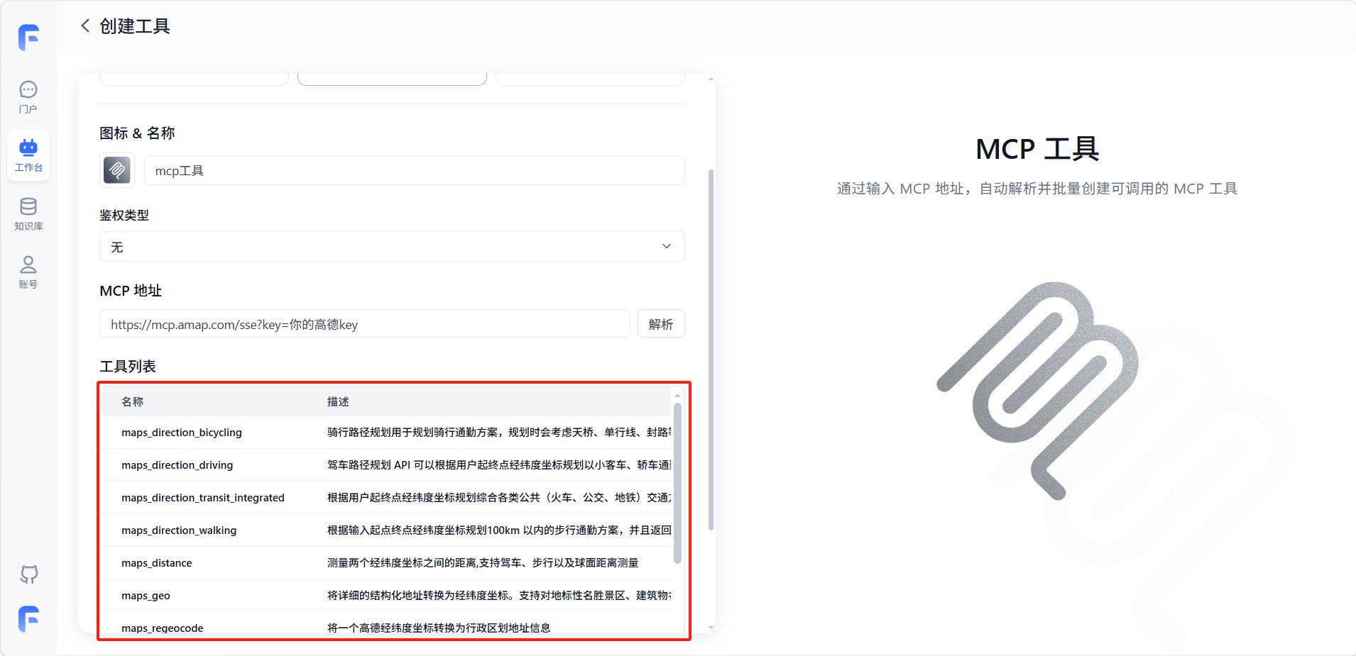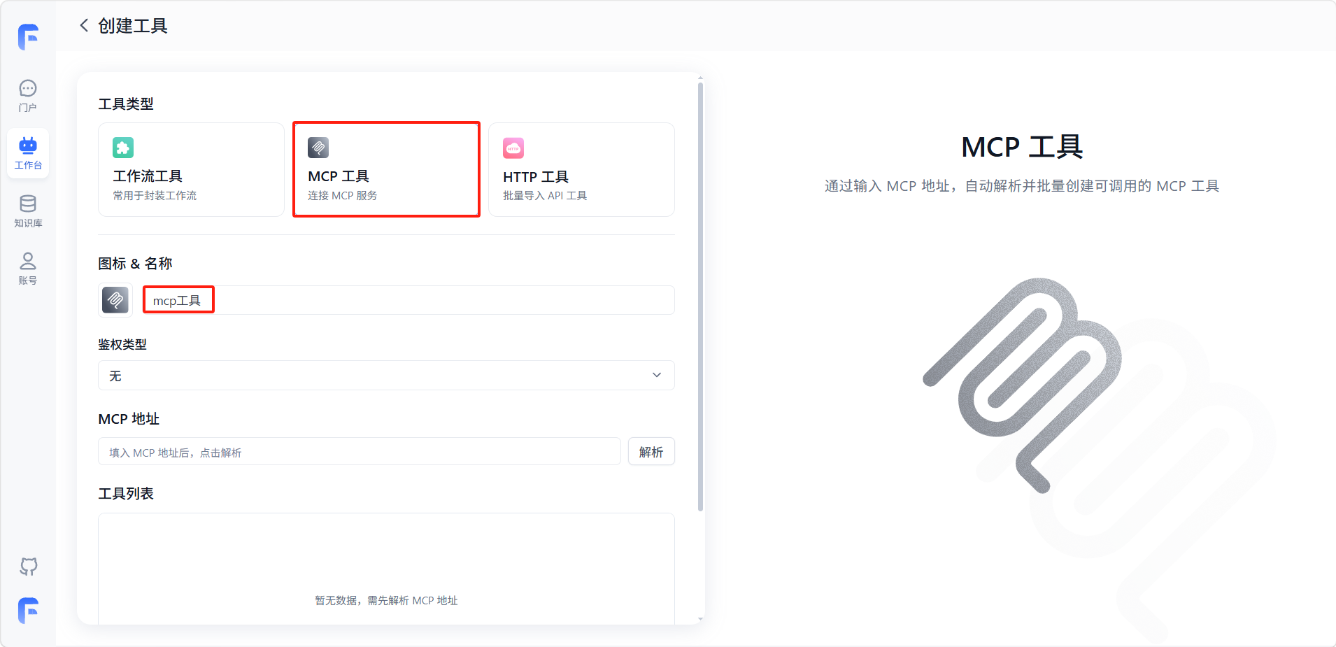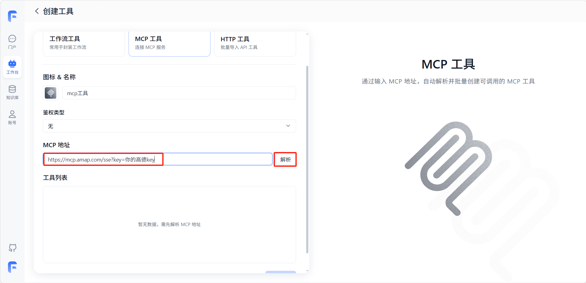 输入 MCP 服务的完整地址(通常为一个 URL),然后点击「解析」按钮。系统会向该地址发送请求,获取服务所提供的工具列表及其参数定义。