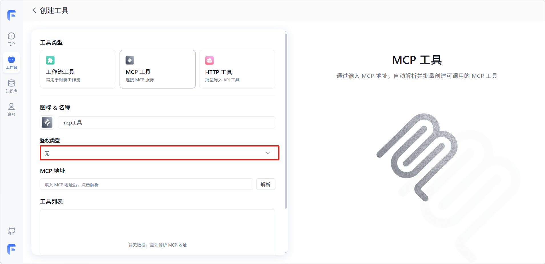 - 无鉴权:如果 MCP 服务部署在内网或不需要身份验证,可以选择此选项,直接通过地址访问。