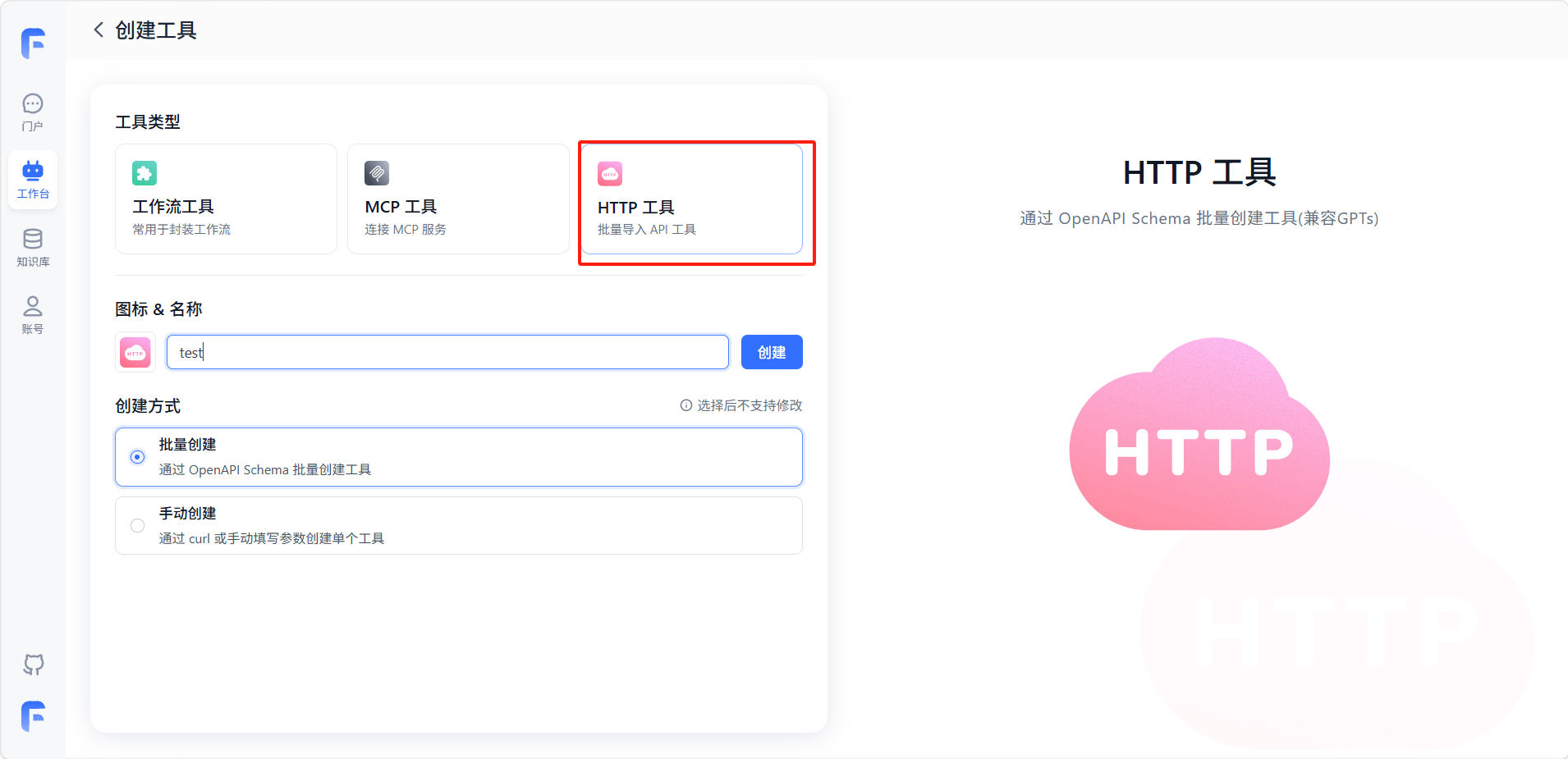 在工具页面选择「HTTP 工具」 类型,设置名称和创建方式,点击「创建」。