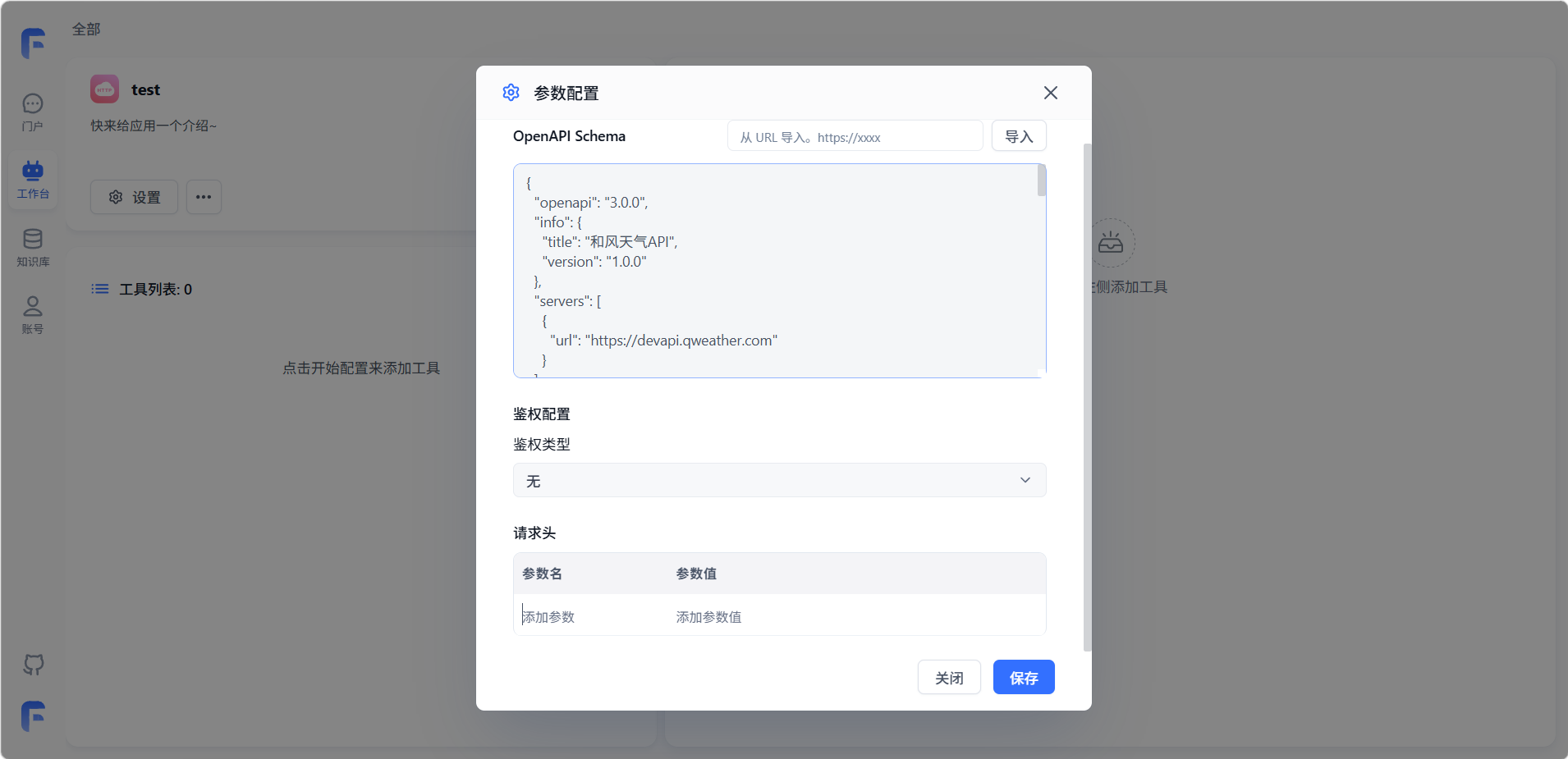 在 OpenAPI Schema区域,可以直接在文本框中粘贴 JSON 格式的 OpenAPI Schema,也可以在右上角输入 URL 点击「导入」自动拉取。