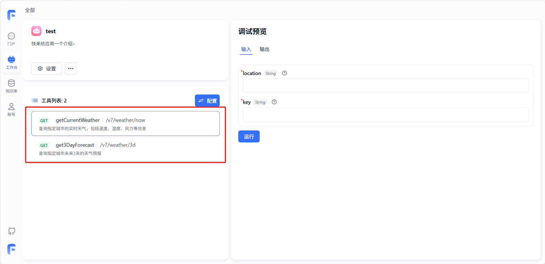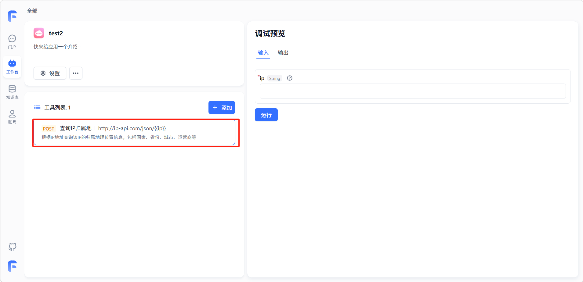 保存工具后,它会出现在工具列表中。在创建或编辑 Agent 时,你可以在工具配置区域中勾选该工具;在工作流中,你可以通过「工具调用」节点来引用它。