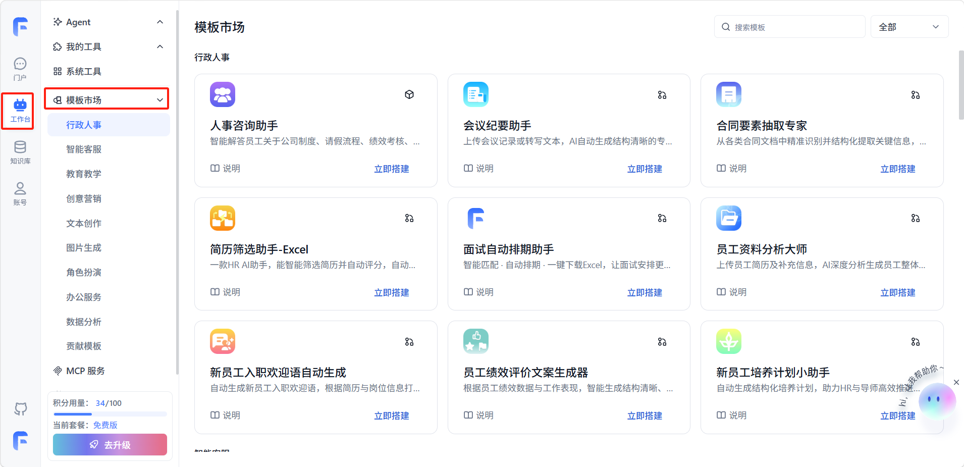 模板市场提供了大量预制的应用模板,覆盖企业办公的各个场景,帮助用户快速搭建 AI 应用而无需从零开始。