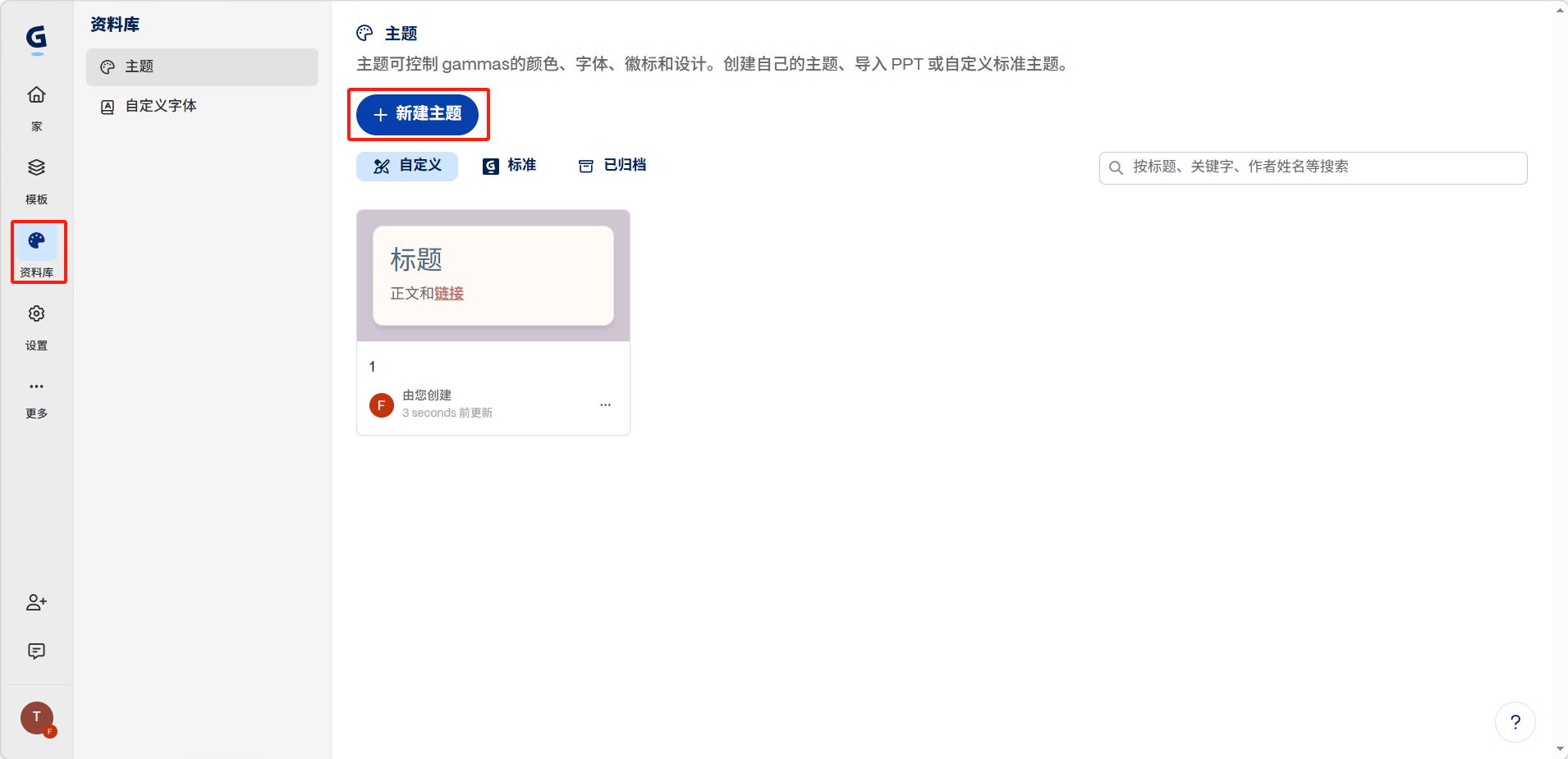 进入左侧「资料库」→「主题」,点击「+ 新建主题」。