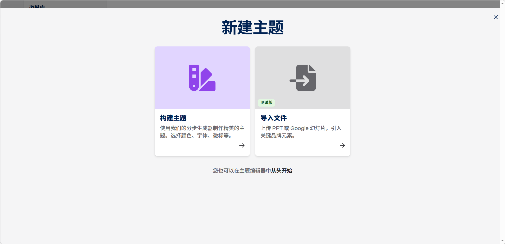 共有两种创建方式,选择「构建主题」进行创建。也可通过「导入文件」上传 PPT 来创建。