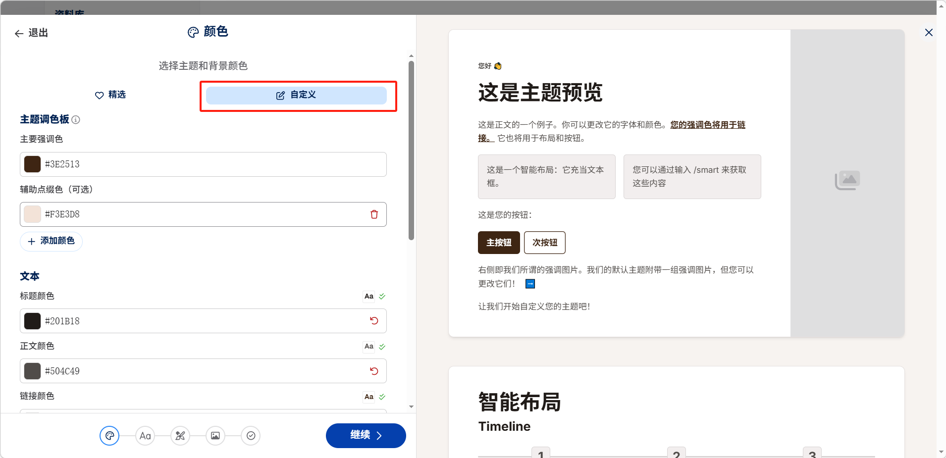 可以从精选色系中挑选主题和背景颜色。或切换到「自定义」手动设置更多的颜色。
