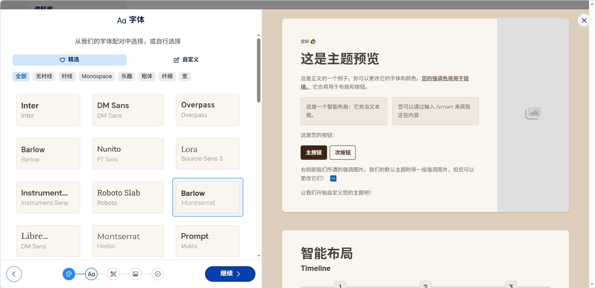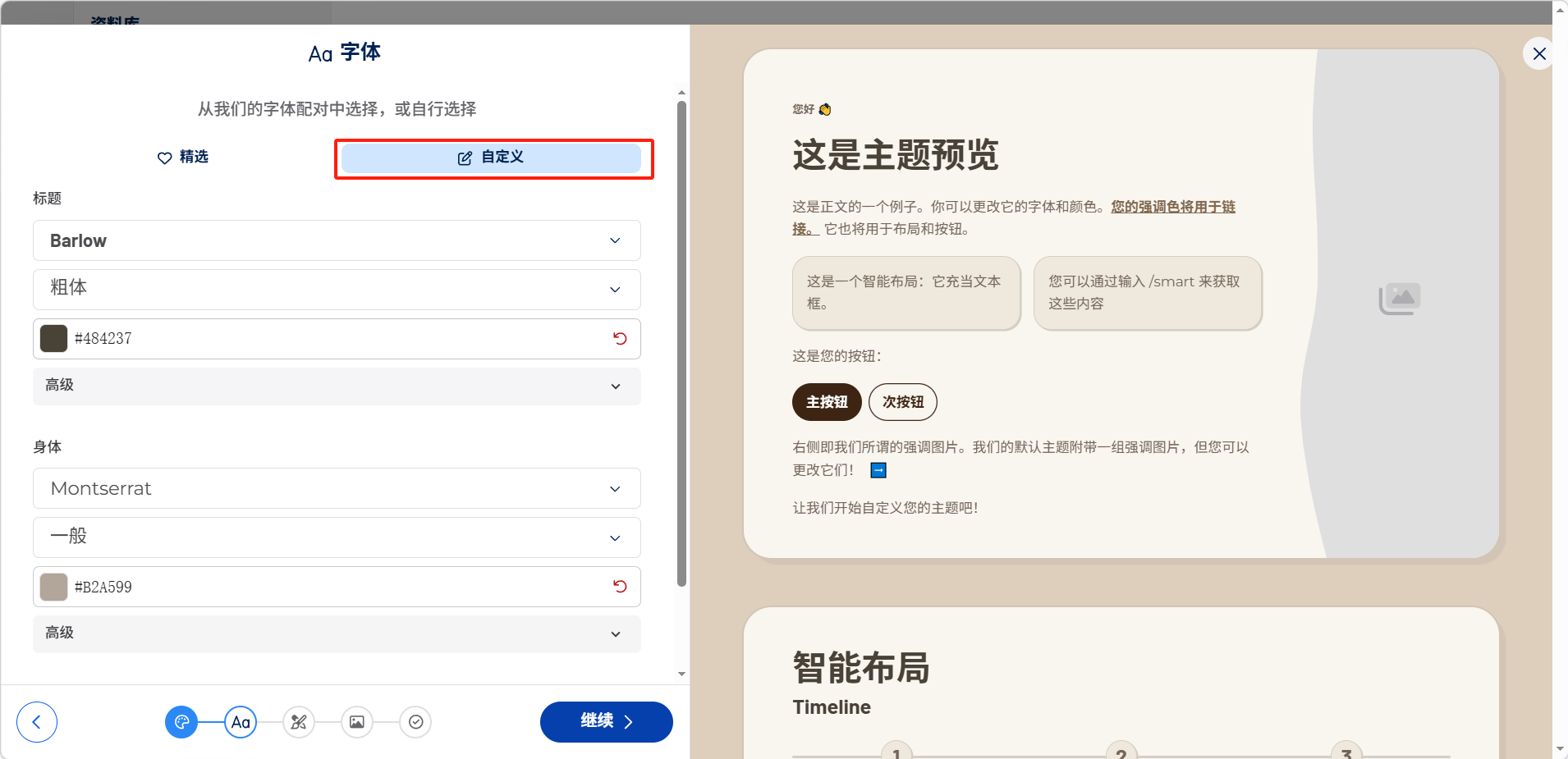 选择标题和正文的字体搭配,或切换到「自定义」进行更详细的设置。