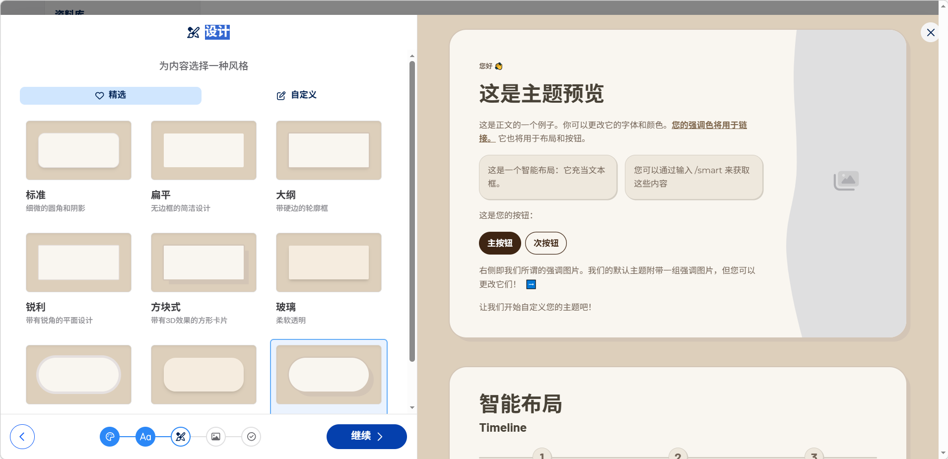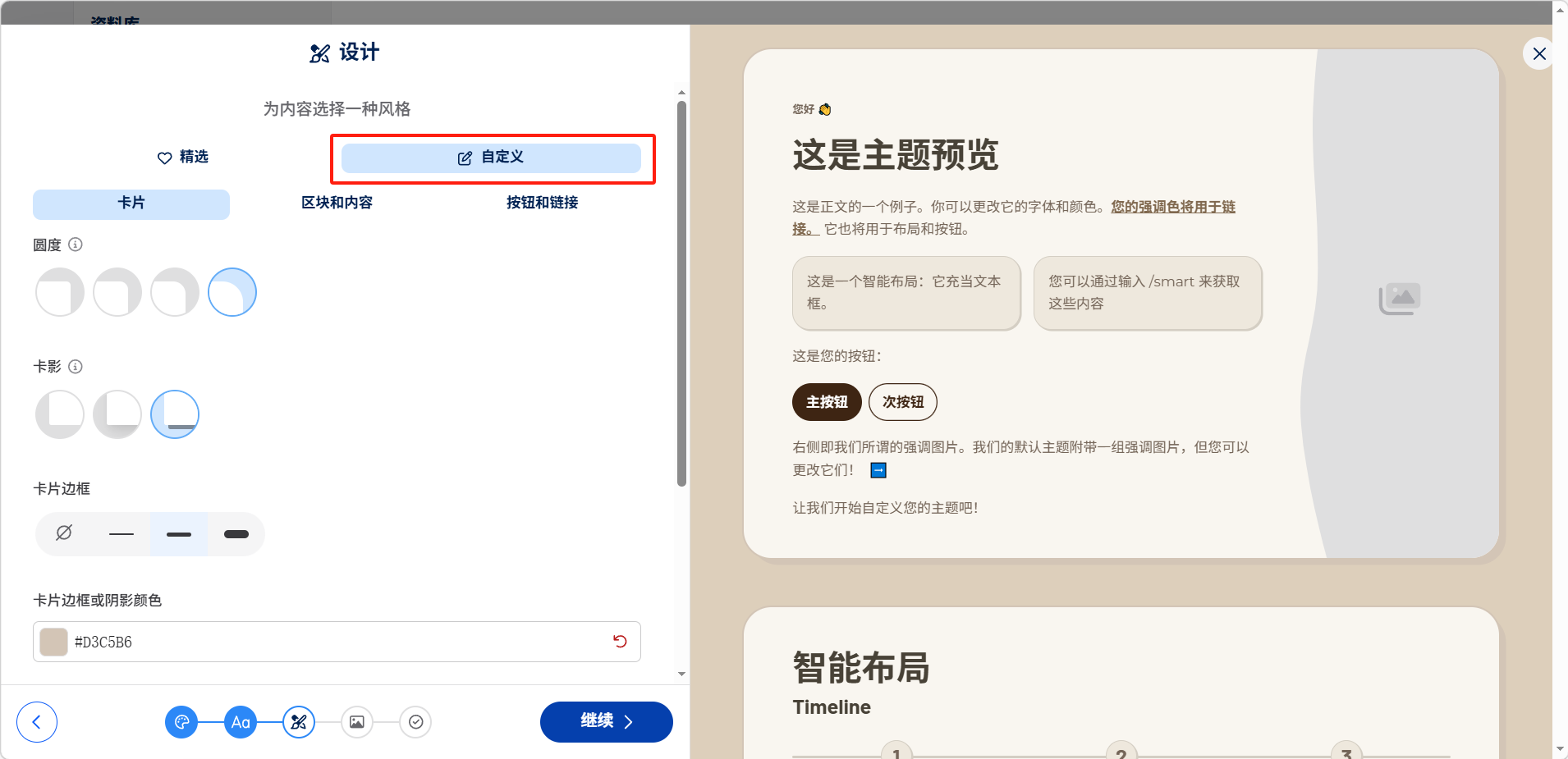 选择卡片样式(标准、扁平、大纲、锐利、方块式、玻璃等),或切换到「自定义」进行更多的设置。