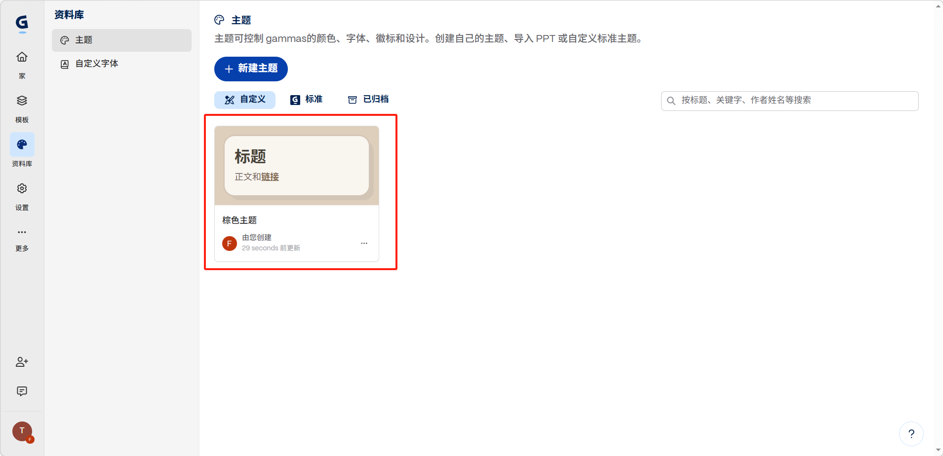 主题分为三个标签页:「自定义」「标准」「已归档」。