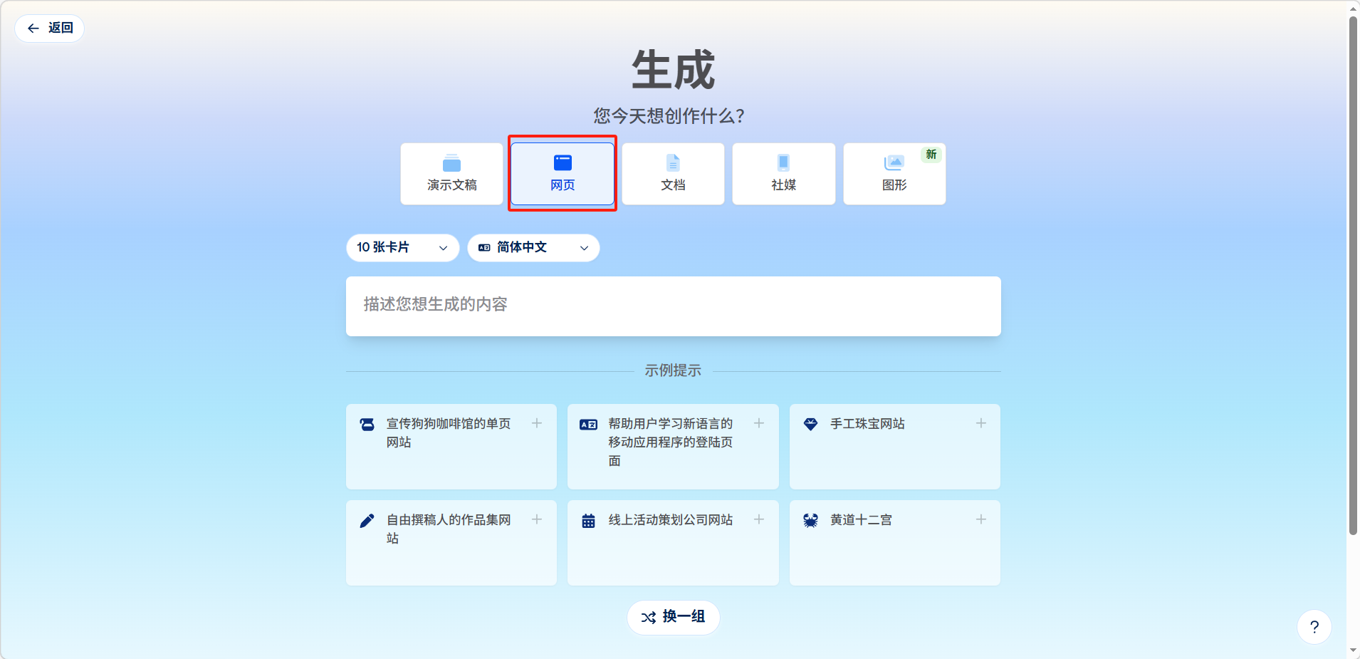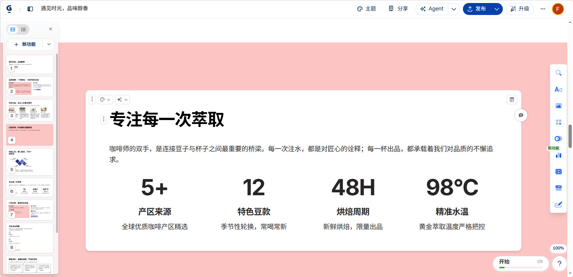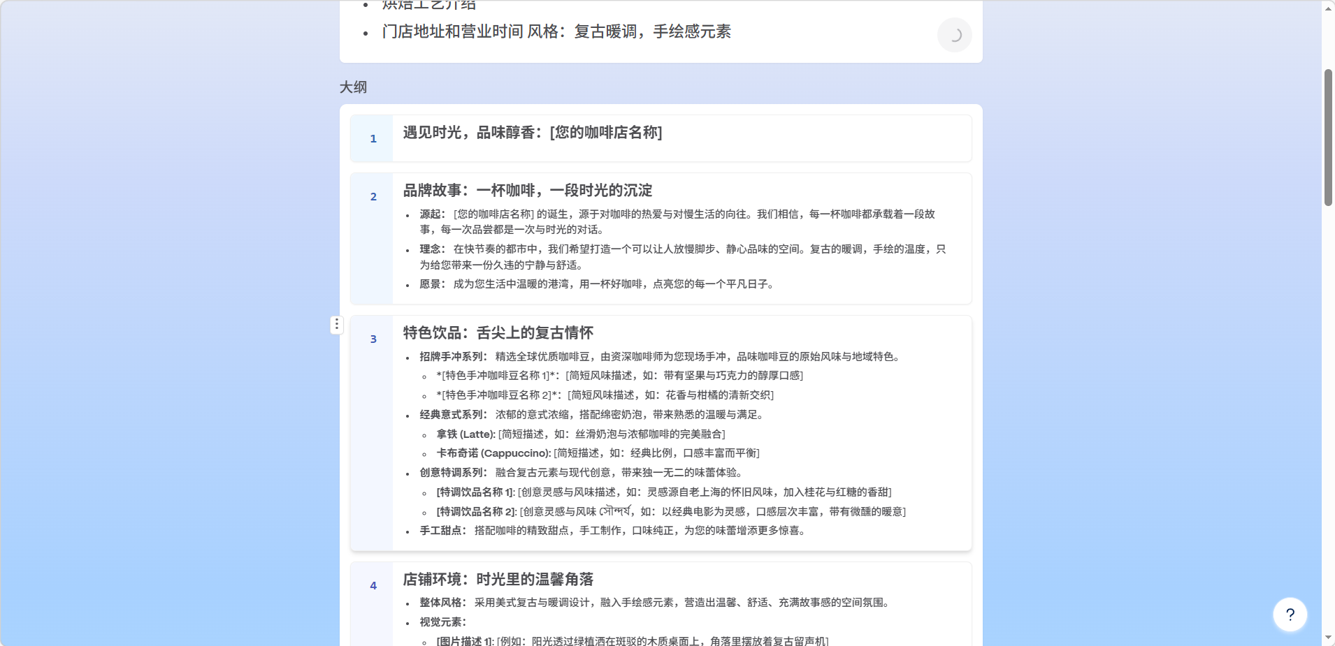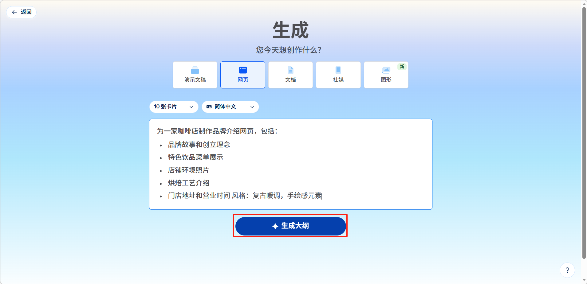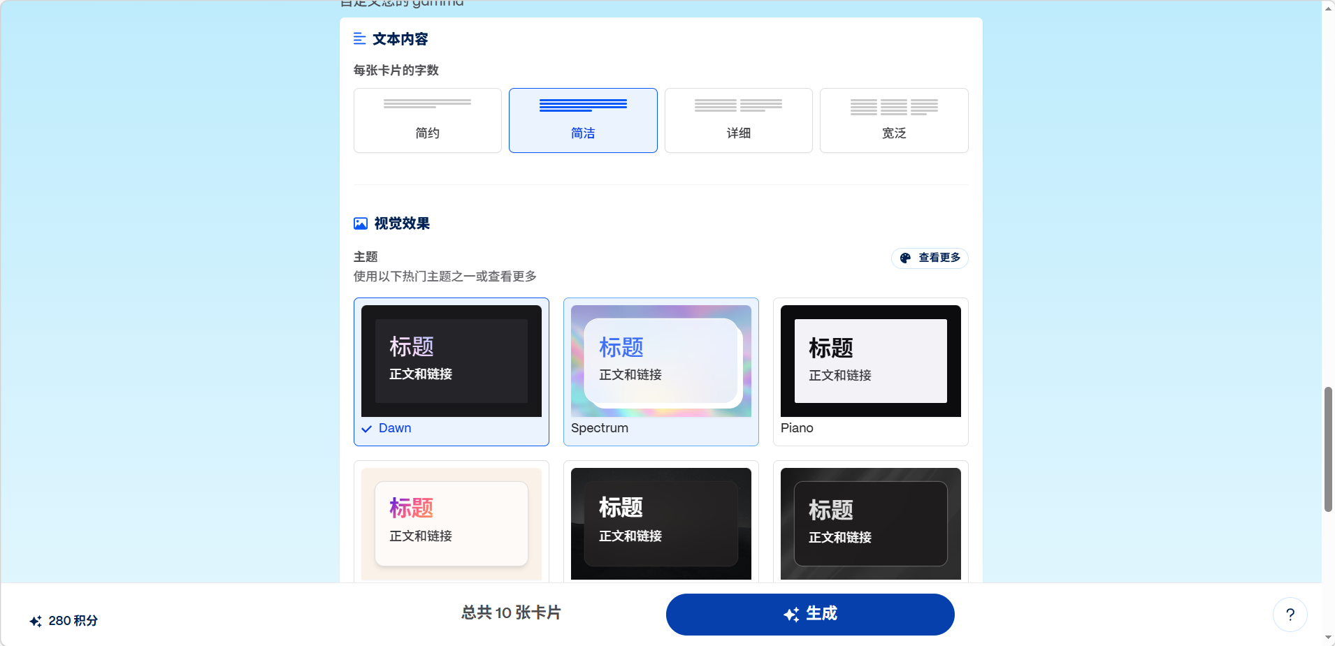 大纲页面可以编辑大纲内容卡片数量、主题风格等参数。设置完成后点击生成,等待 AI 自动完成页面设计。