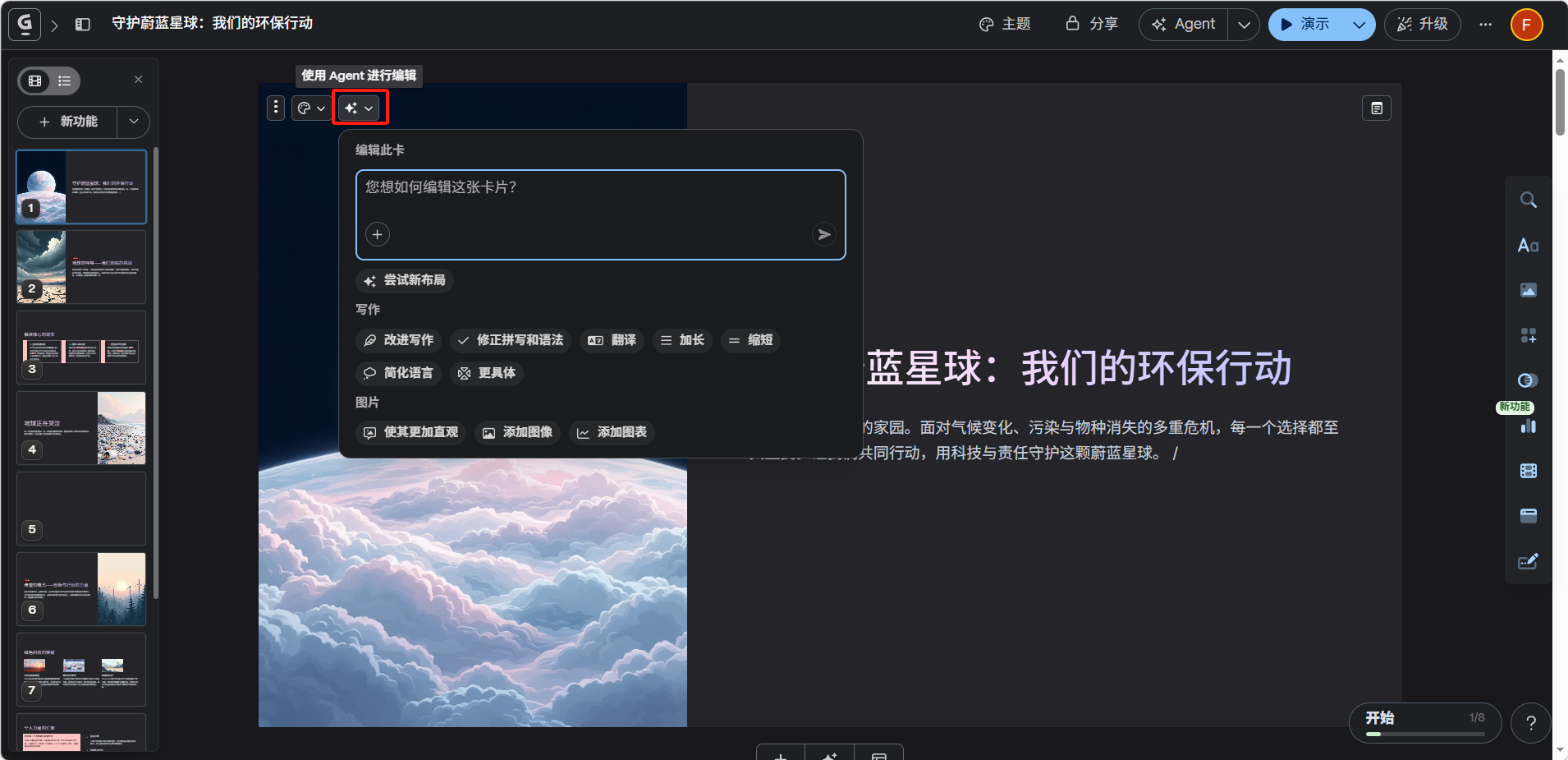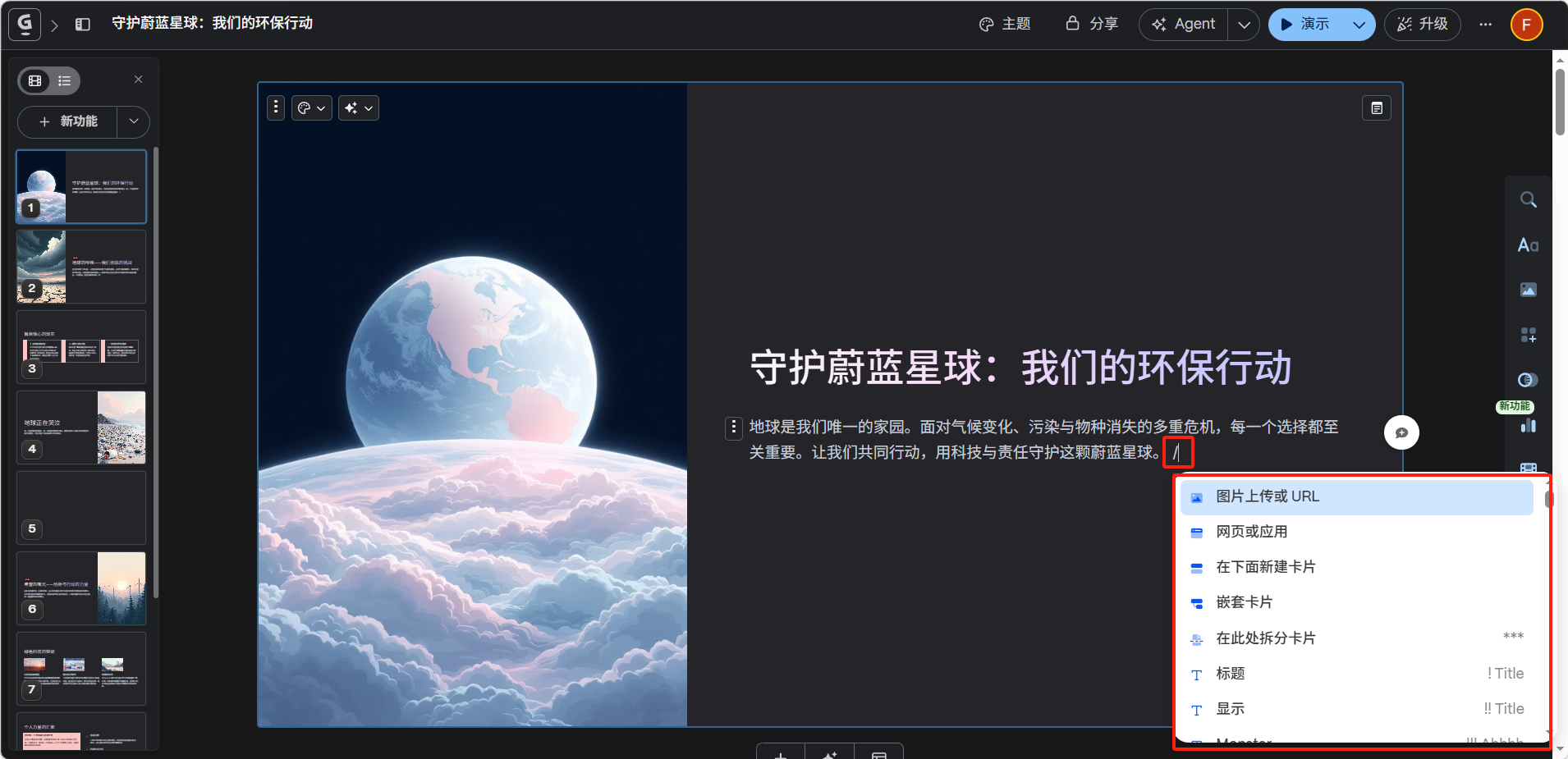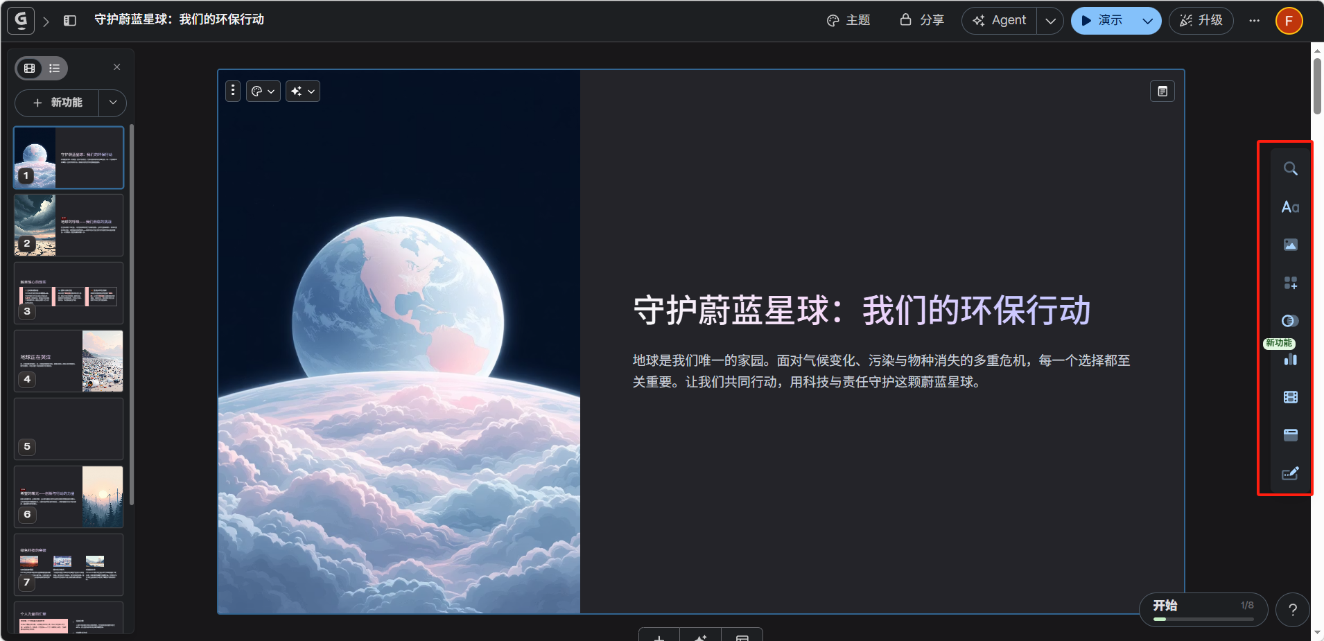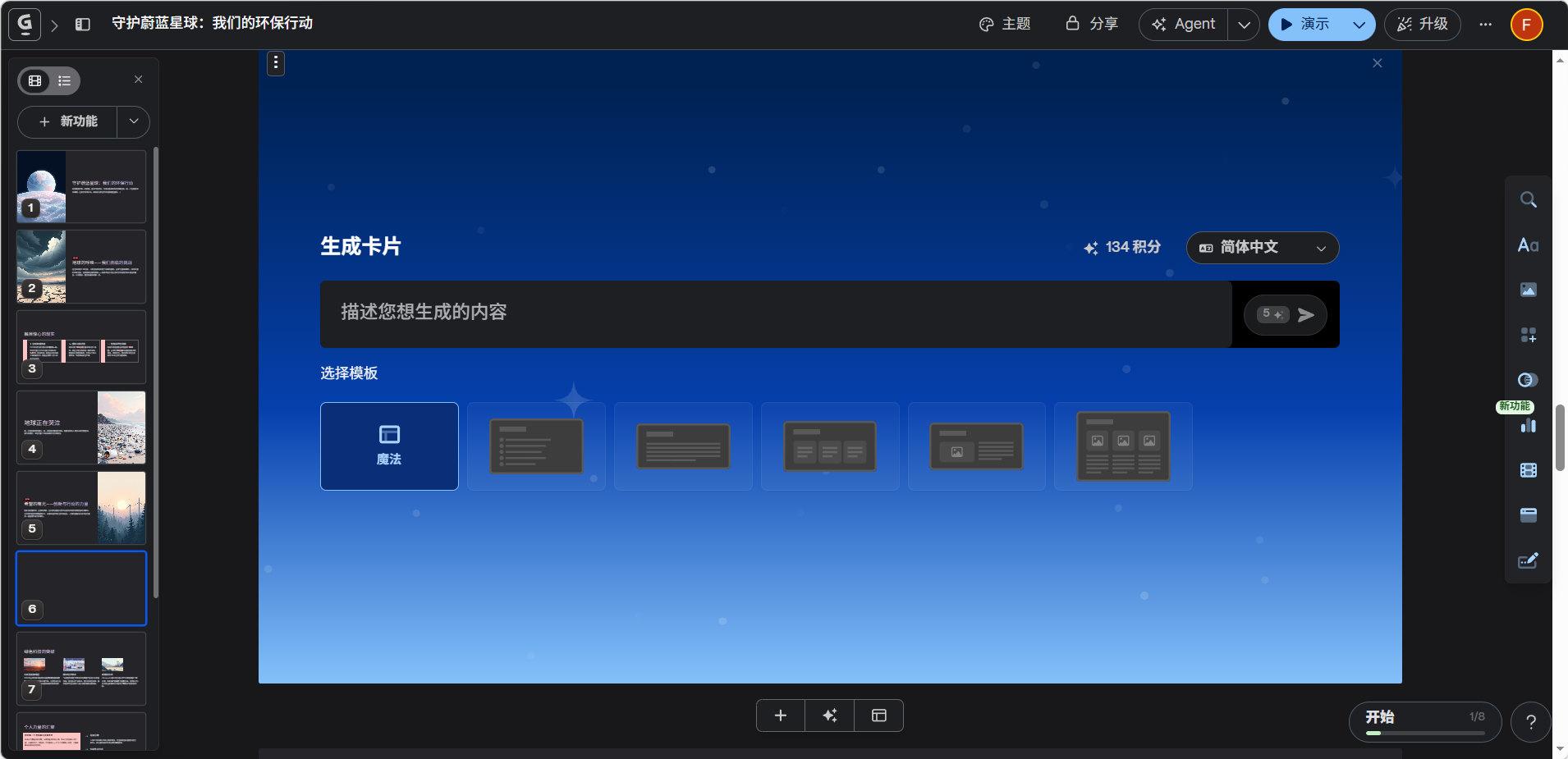 生成内容后,Gamma 会进入编辑器界面。左侧为卡片缩略图导航,中间为卡片编辑区域,右侧为插入栏。以下介绍编辑器中的核心功能。