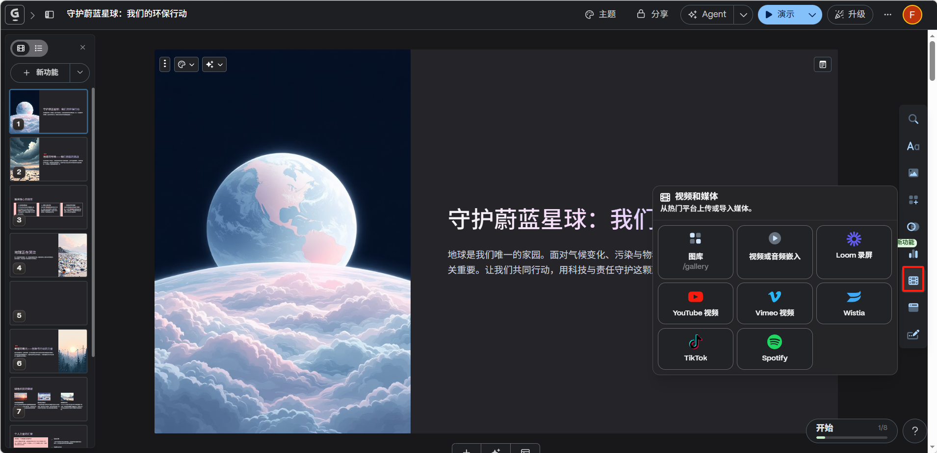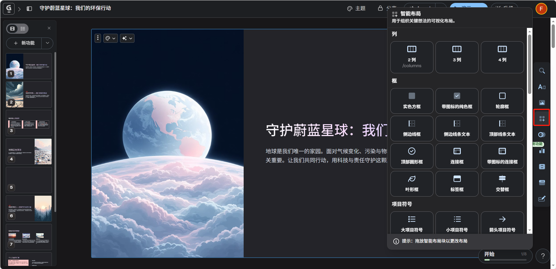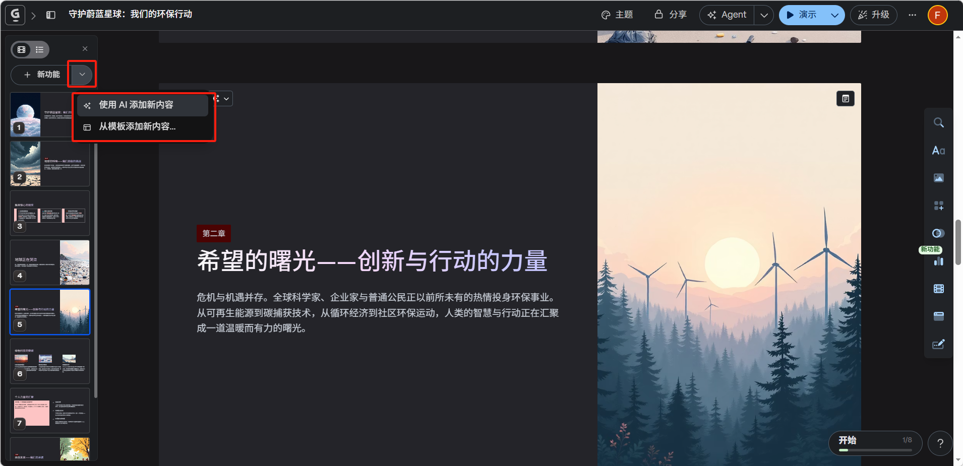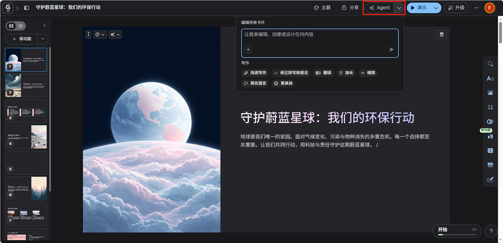 生成内容后,Gamma 会进入编辑器界面。左侧为卡片缩略图导航,中间为卡片编辑区域,右侧为插入栏。以下介绍编辑器中的核心功能。