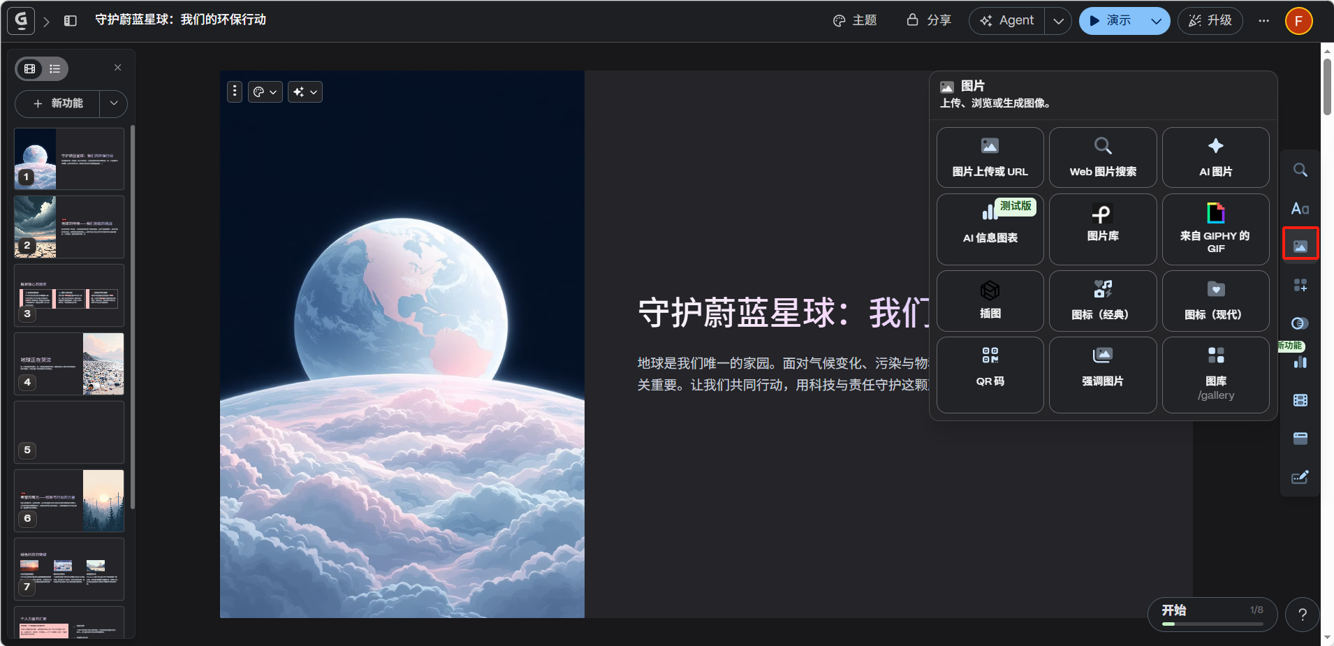 支持多种图片来源:本地上传或 URL、Web 图片搜索、AI 生成图片、AI 信息图表(测试版)、图片库、GIPHY 动图、插图、经典/现代图标、QR 码、强调图片和图库。