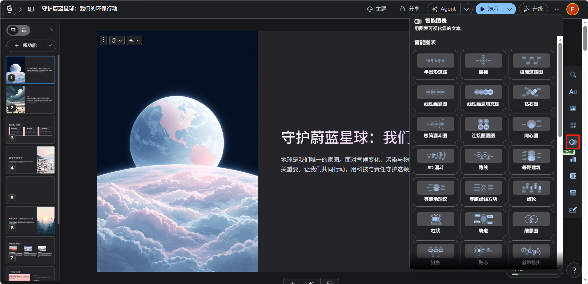 用图表可视化文本内容,提供丰富的图表模板,如半圆形道路、目标、维恩图、漏斗图、同心圆、路线、齿轮、柱状、轨道等数十种样式。