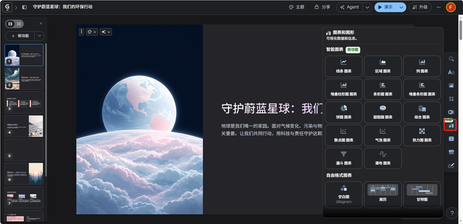 插入图表后可在图表编辑器中输入数据、调整图表类型、修改颜色方案和坐标轴设置。