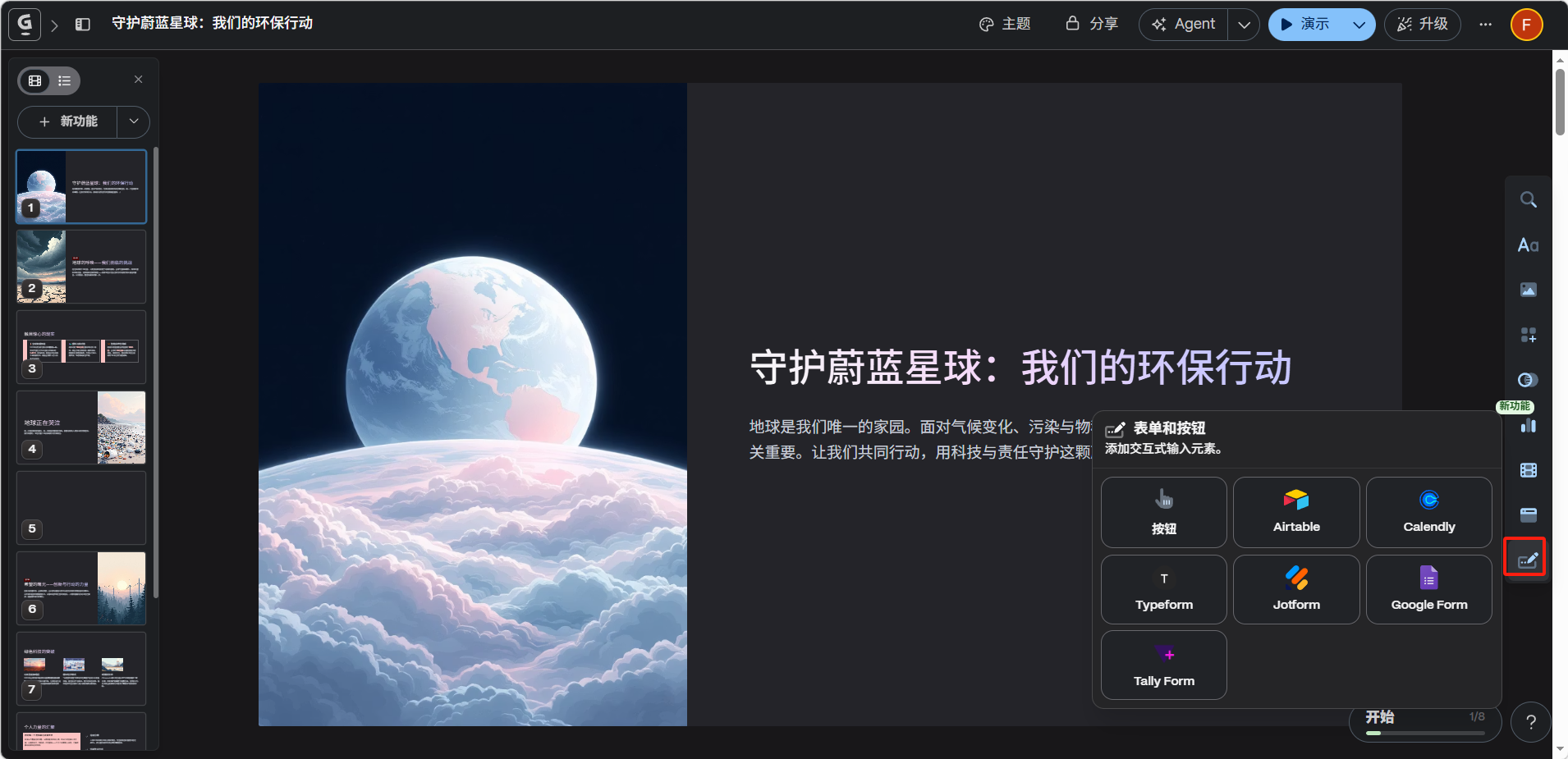 添加交互式输入元素,支持按钮以及第三方表单服务:Airtable、Calendly、Typeform、Jotform、Google Form、Tally Form。