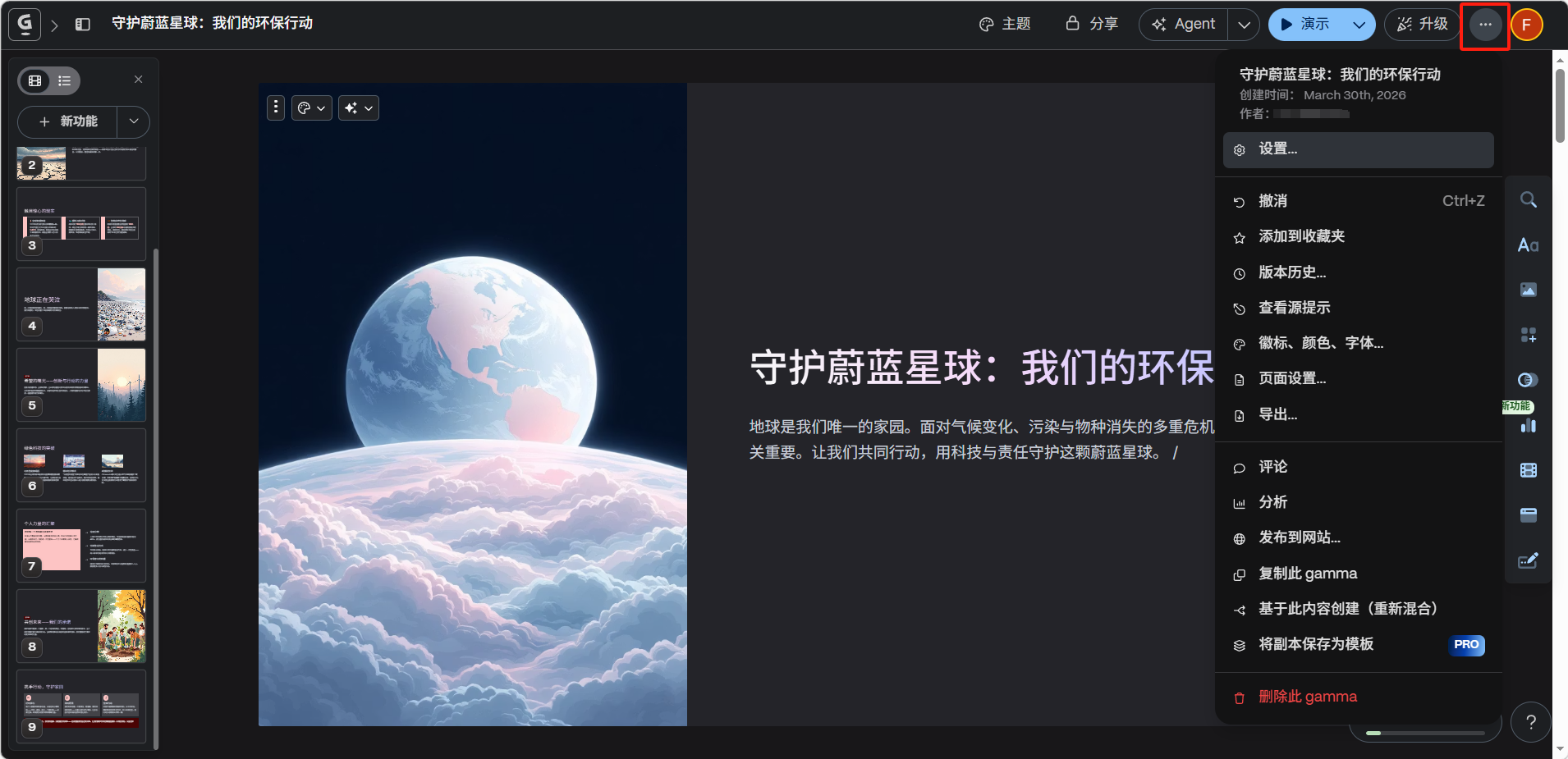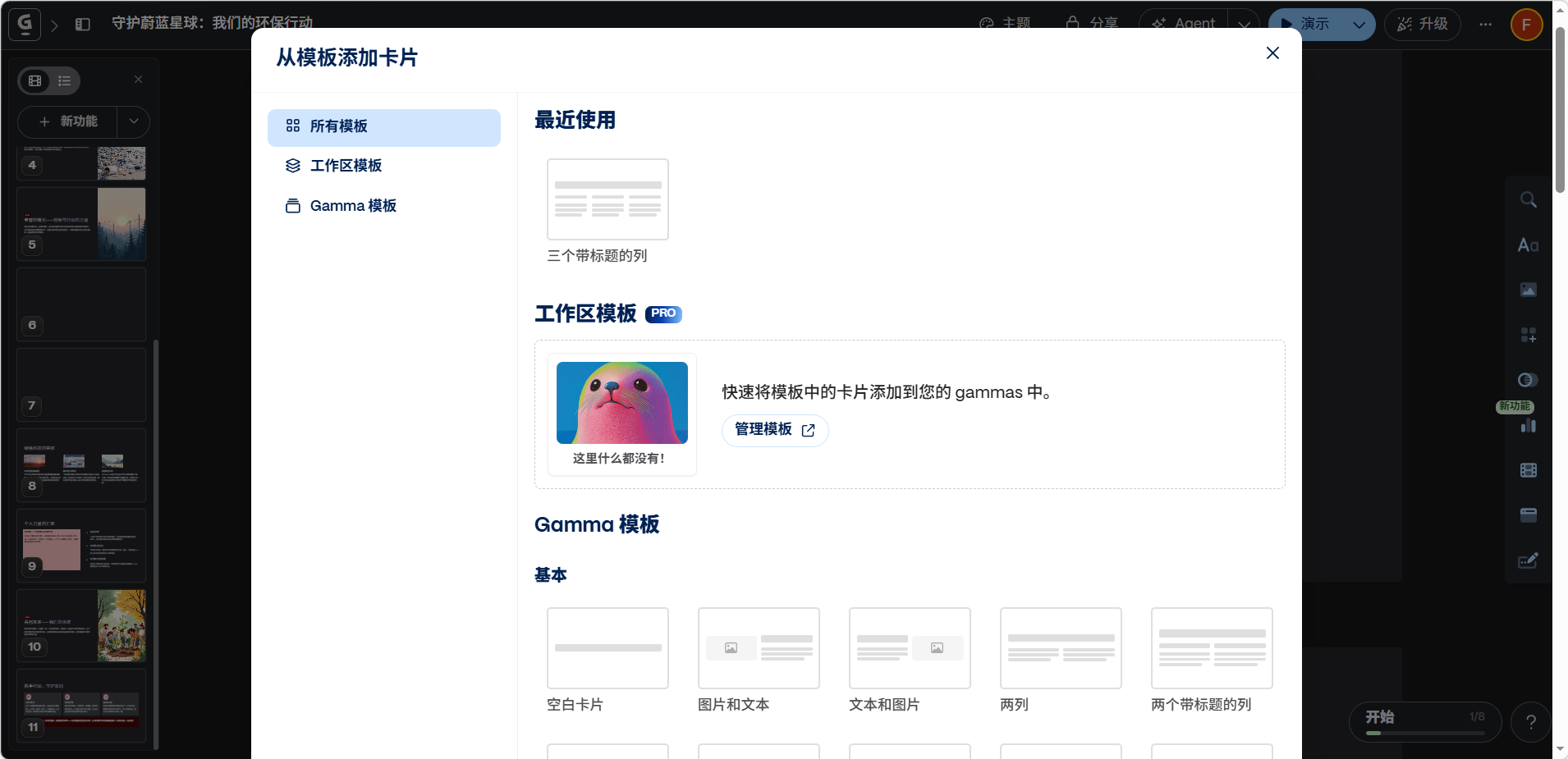- 将副本保存为模板(Pro):将当前 Gamma 保存为可复用的模板