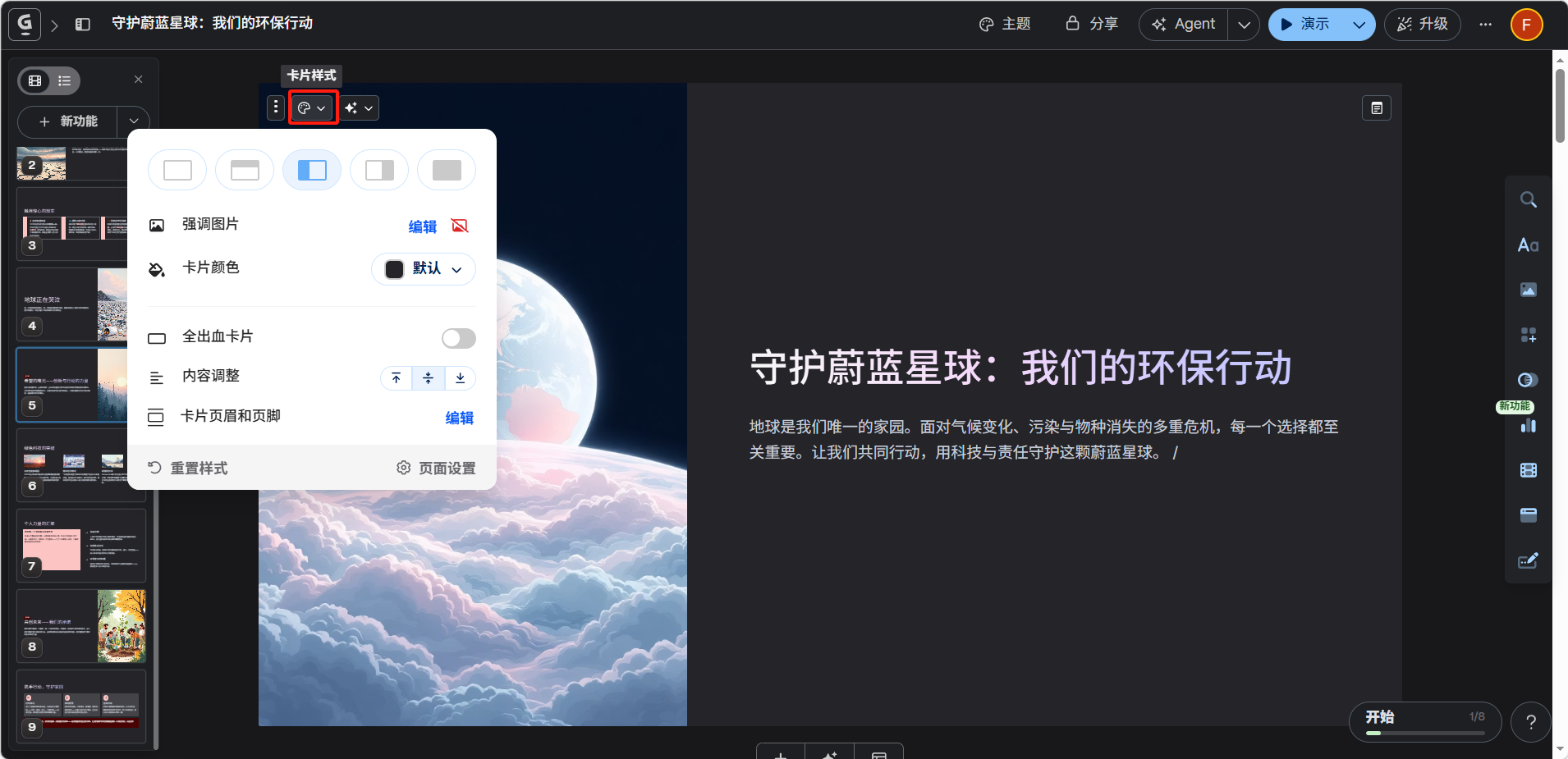 点击卡片左上角的样式图标,可以调整当前卡片的视觉样式:
