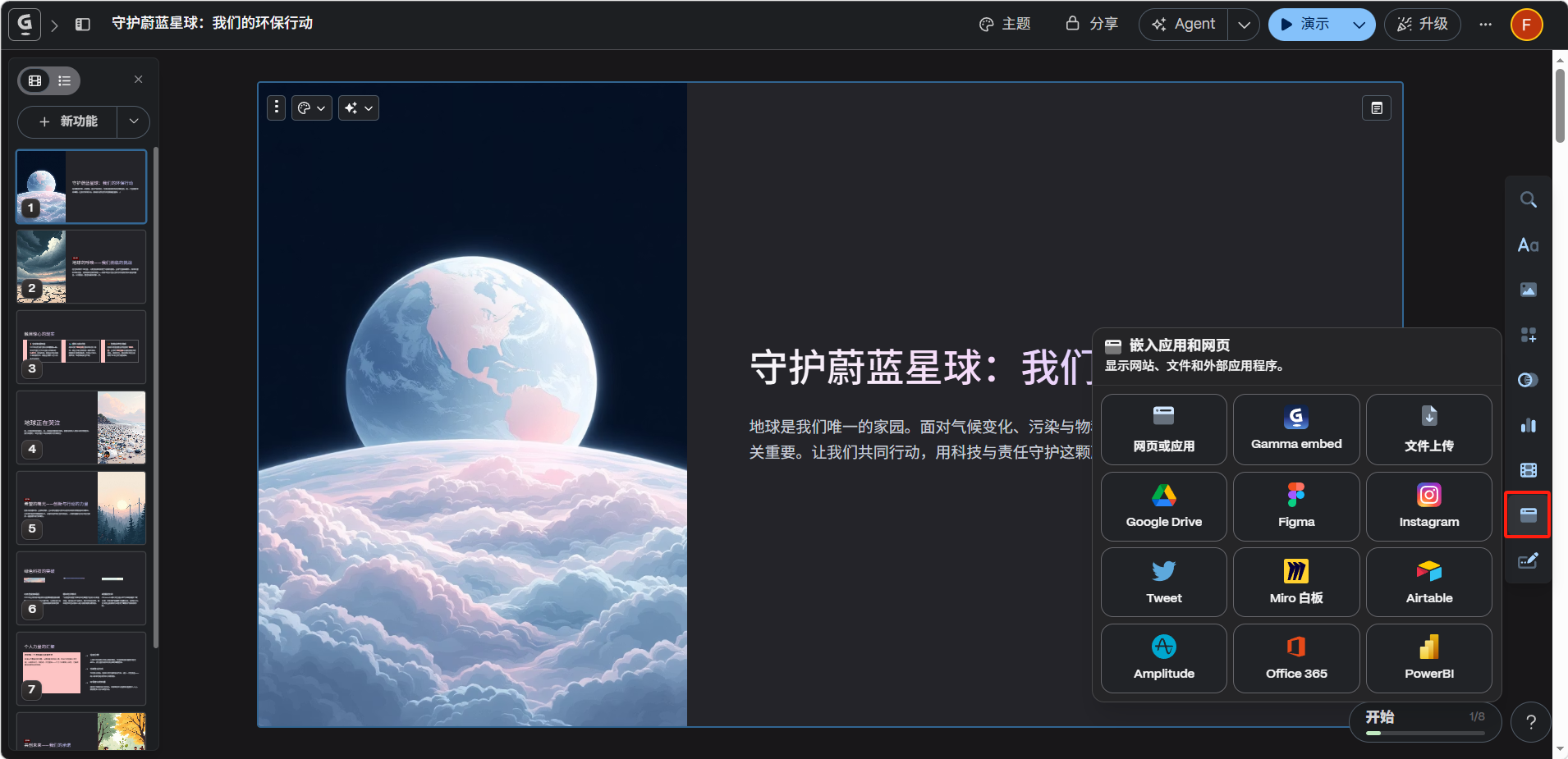 可嵌入外部网站和应用程序,包括:网页或应用、Gamma embed、Google Drive、Figma、Instagram、Tweet、Miro 白板、Airtable、Amplitude、Office 365、PowerBI 等。