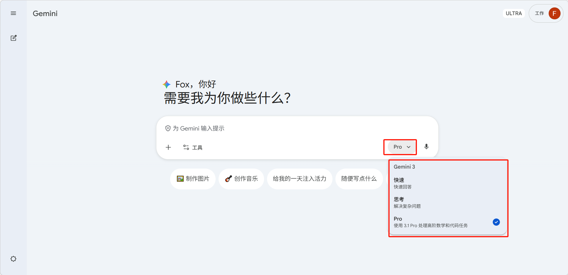 Gemini 提供多种模型模式,你可以在输入框右下角的模型选择器中切换: