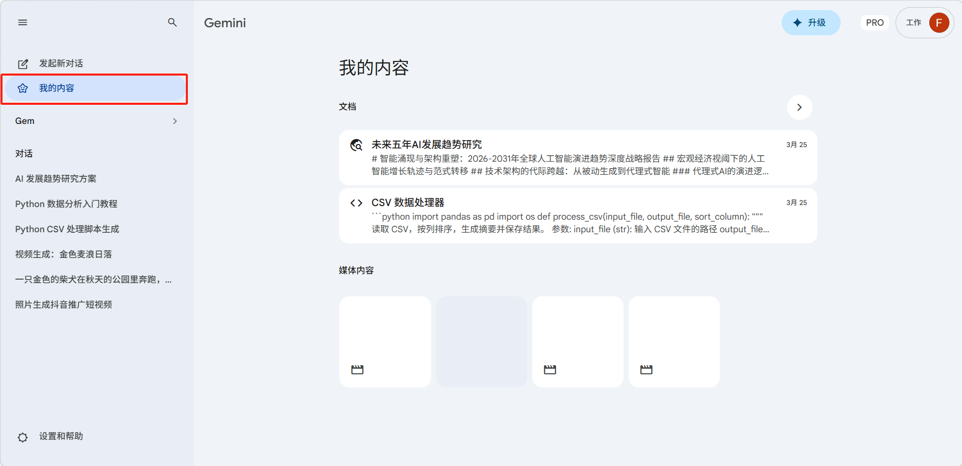 「我的内容」相当于 Gemini 的个人资料库,帮助你快速找到之前创作的素材,而不需要逐个翻阅对话历史。