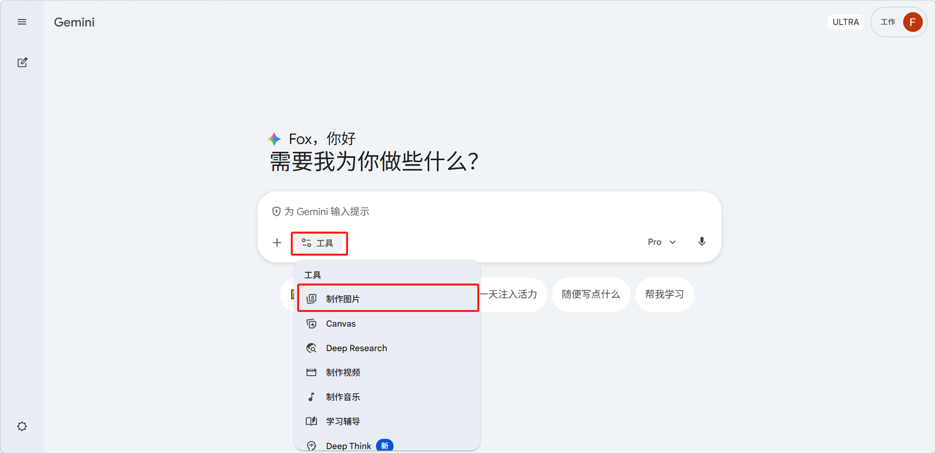 Gemini 内置了 Imagen 和 Nano Banana Pro 图片生成模型,可以通过文字描述直接生成 AI 图片。